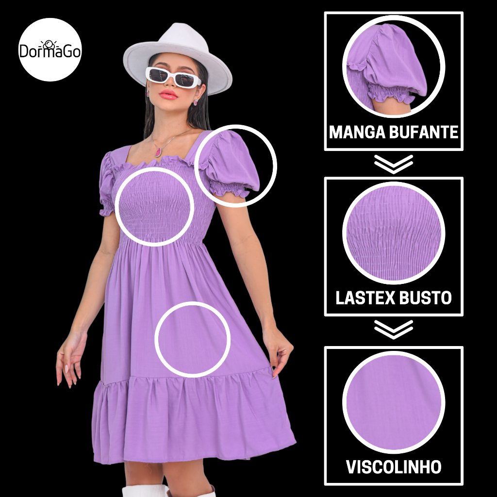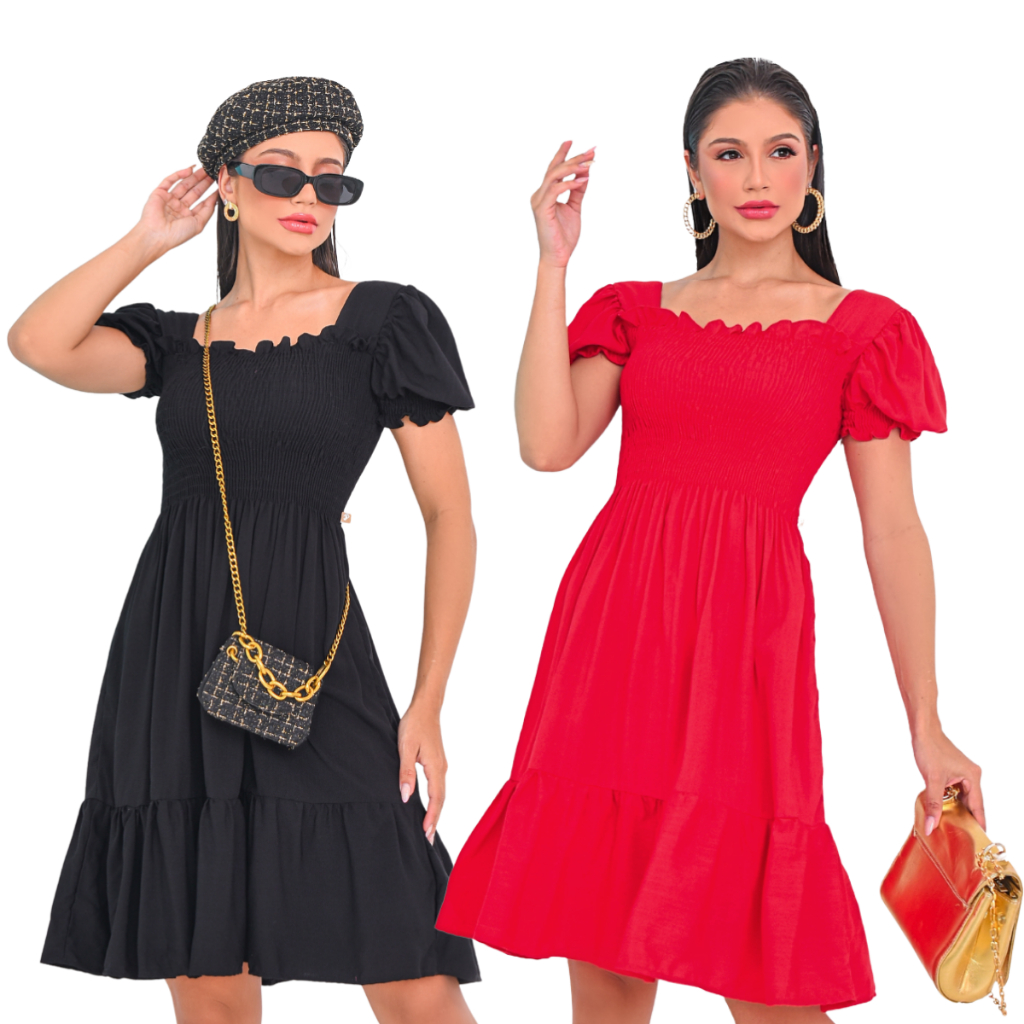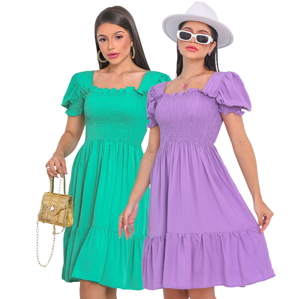 Kit 2 Vestido Feminino Manga Curta Bufante Com Lastex Babado