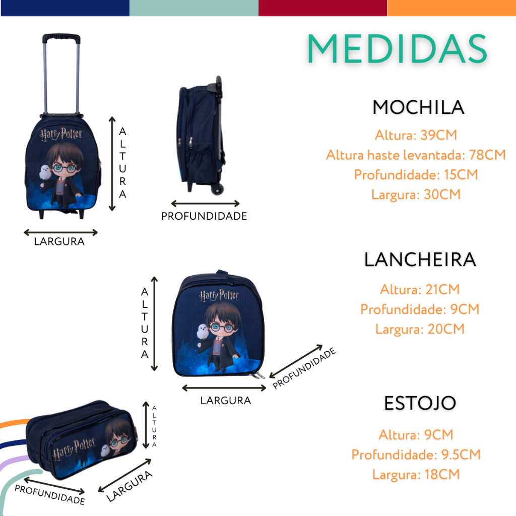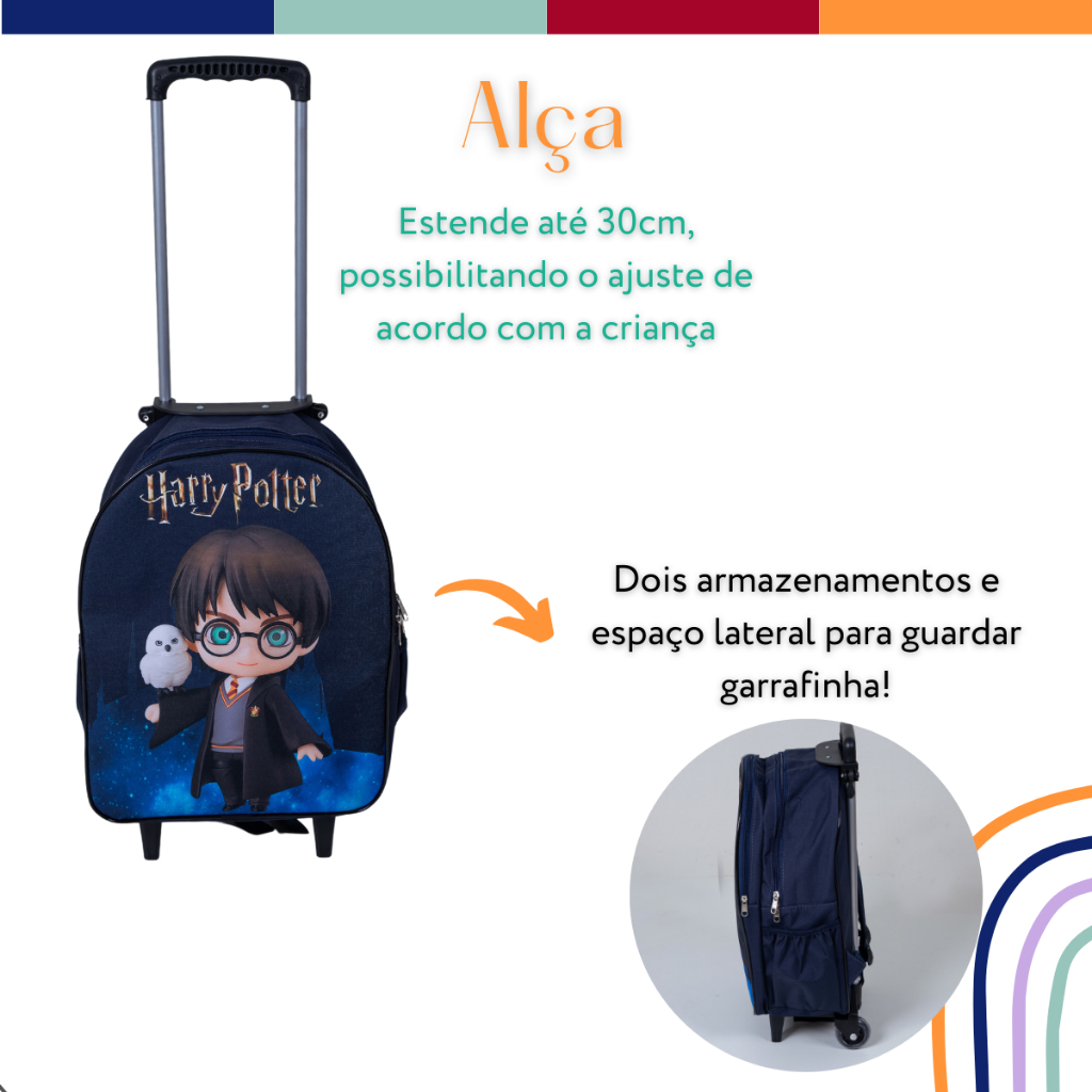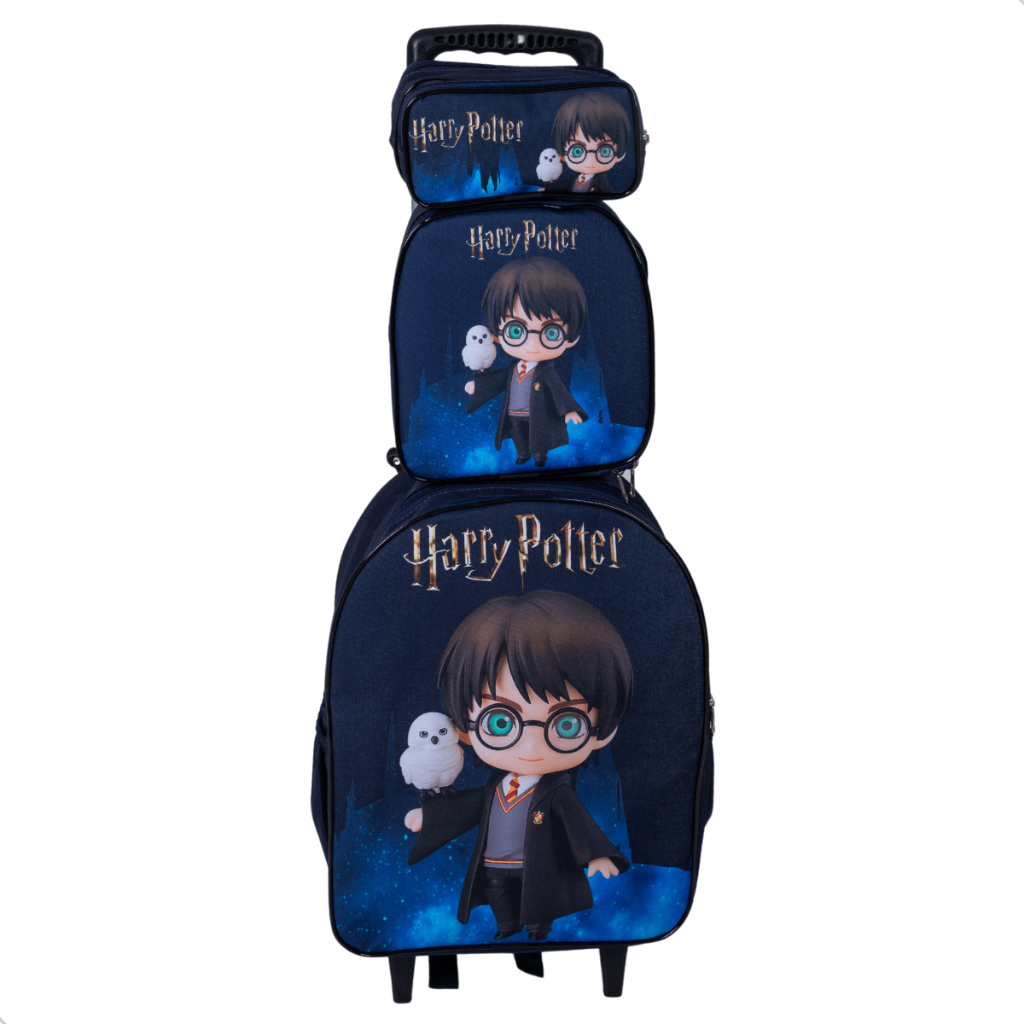 Kit Mochila Infantil Harry Potter de Rodinhas + Lancheira + Estojo Azul Marinho