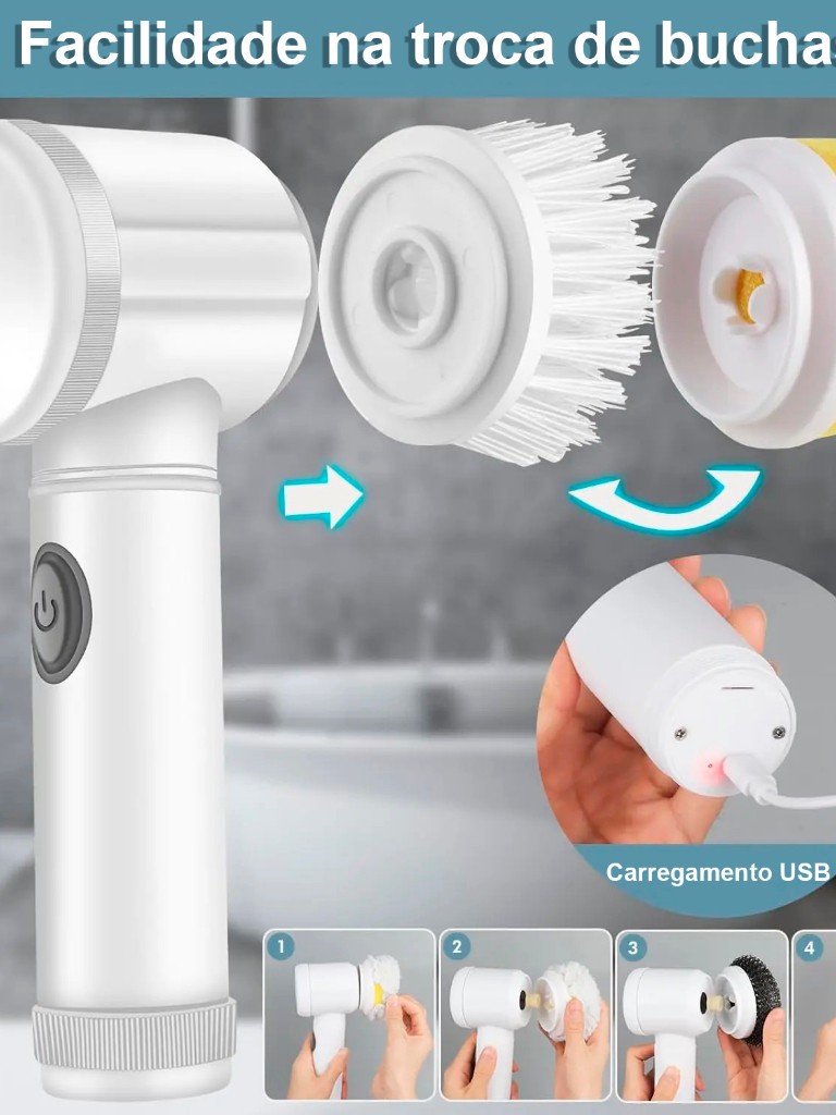 Escova Elétrica de Limpeza 5 em 1 USB Escova Giratória Multiuso Cozinha Banheiro Pia Azulejo