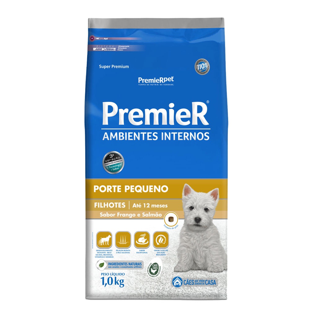 Ração Premier Ambientes Internos Cães Filhotes Frango e Salmão 1kg
