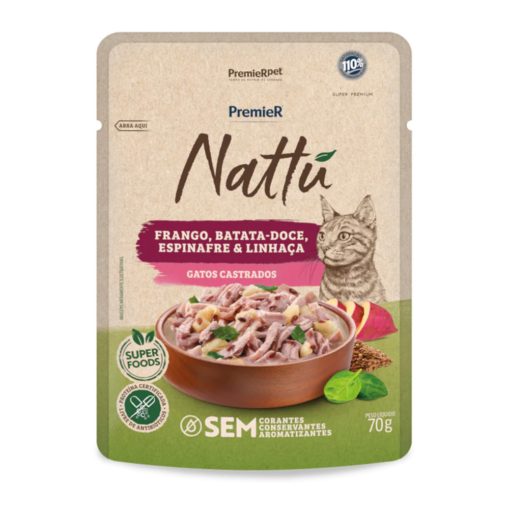 Kit 20un. Ração Úmida Premier Nattu Sachê Gatos Castrados Frango, Batata Doce, Espinafre e Linhaça 70g