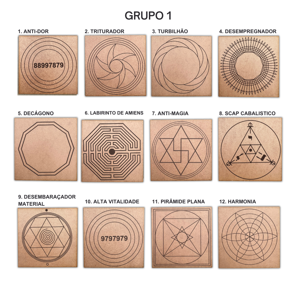 kit caixa + 12 gráficos radiônicos em mdf 20x20cm + relógio com prancha francesa (Grupo 1)