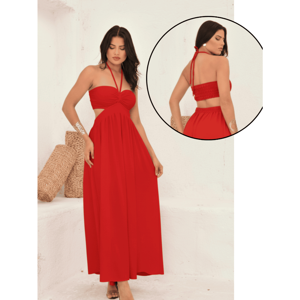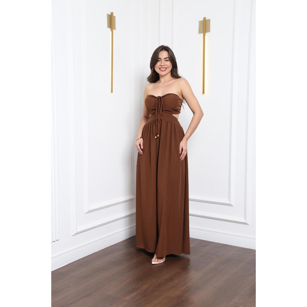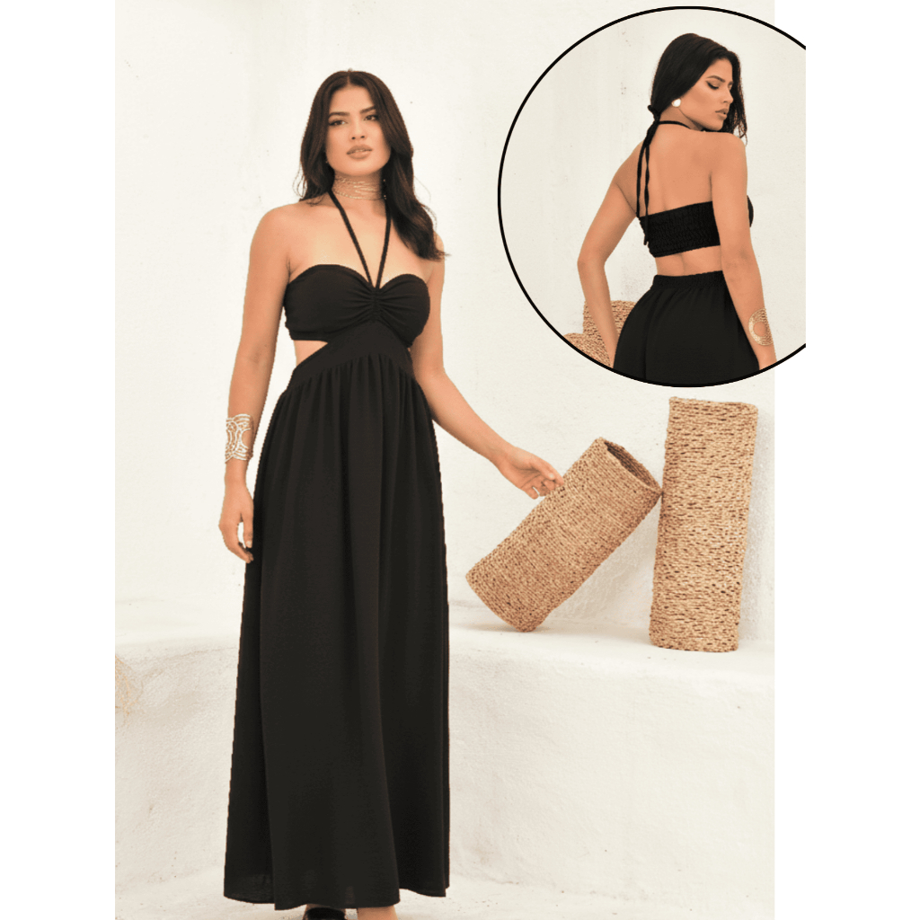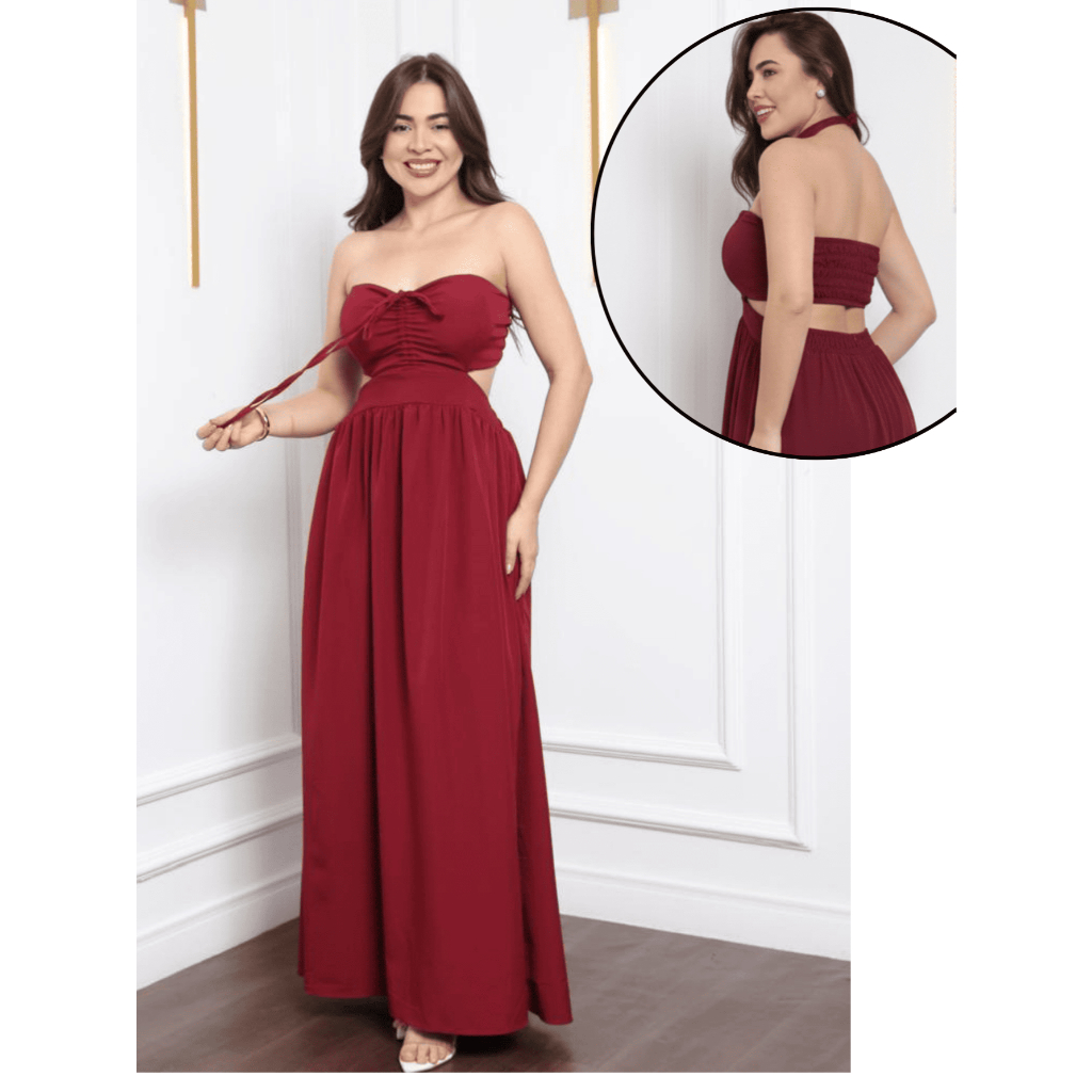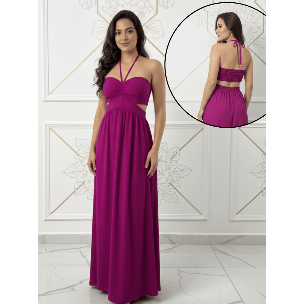 Vestido Longo Elegante detalhe Decote, Elastéx traseiro Atemporal .