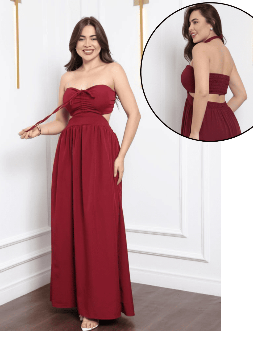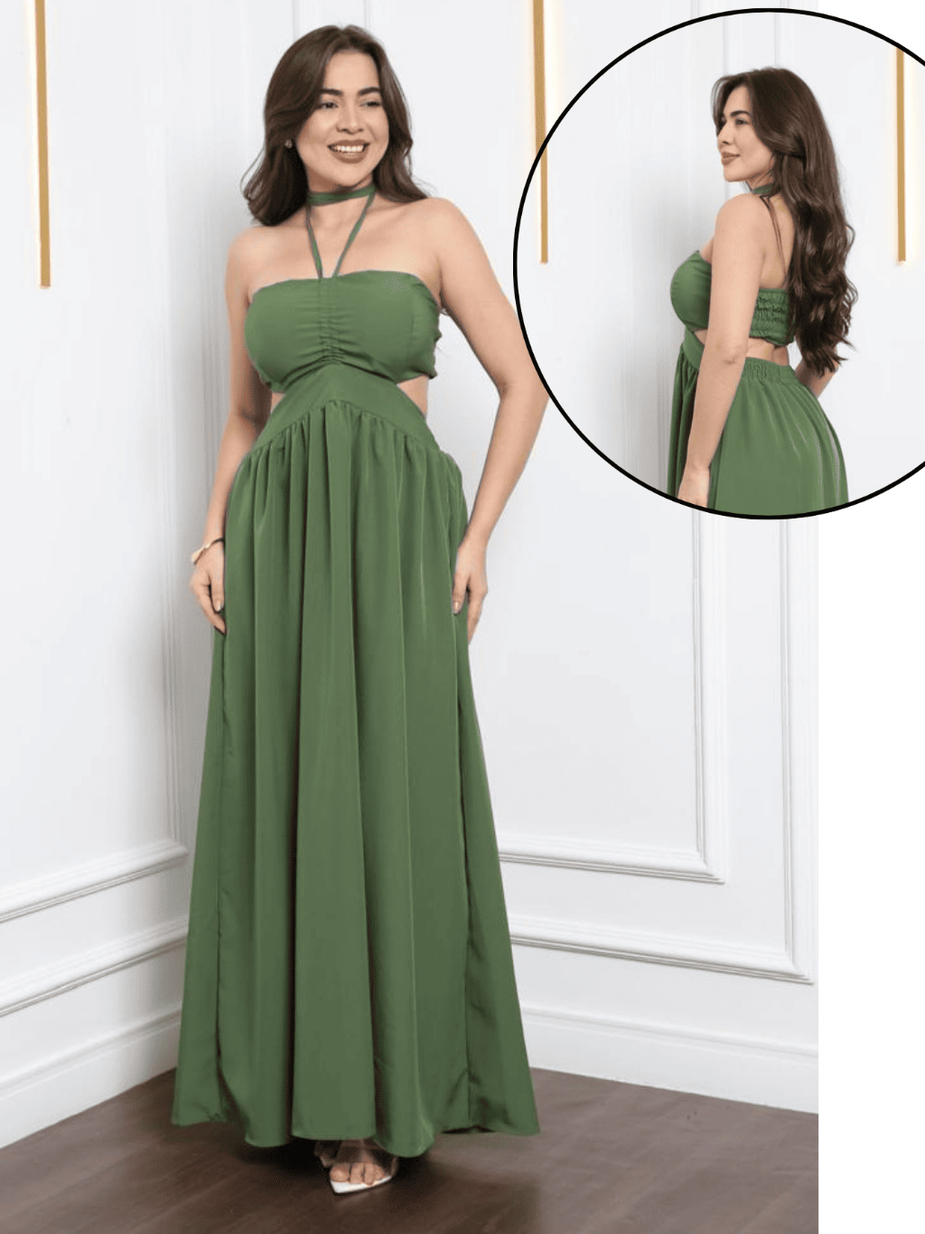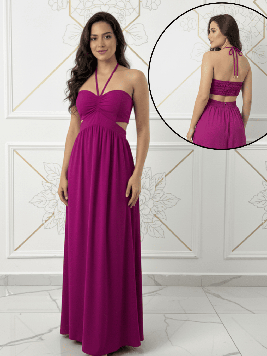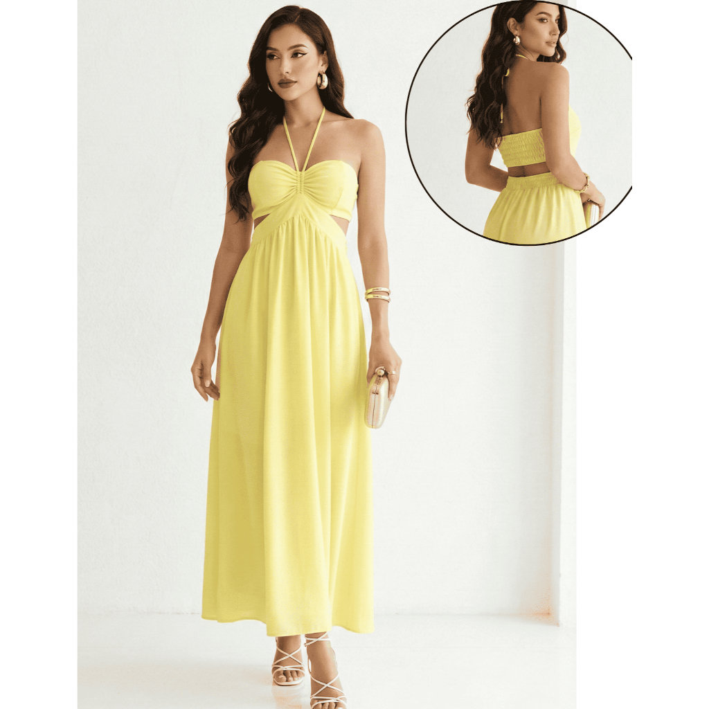 Vestido Longo Elegante detalhe Decote, Elastéx traseiro Atemporal .
