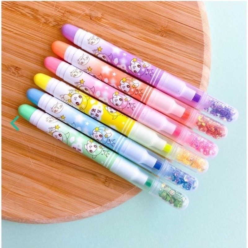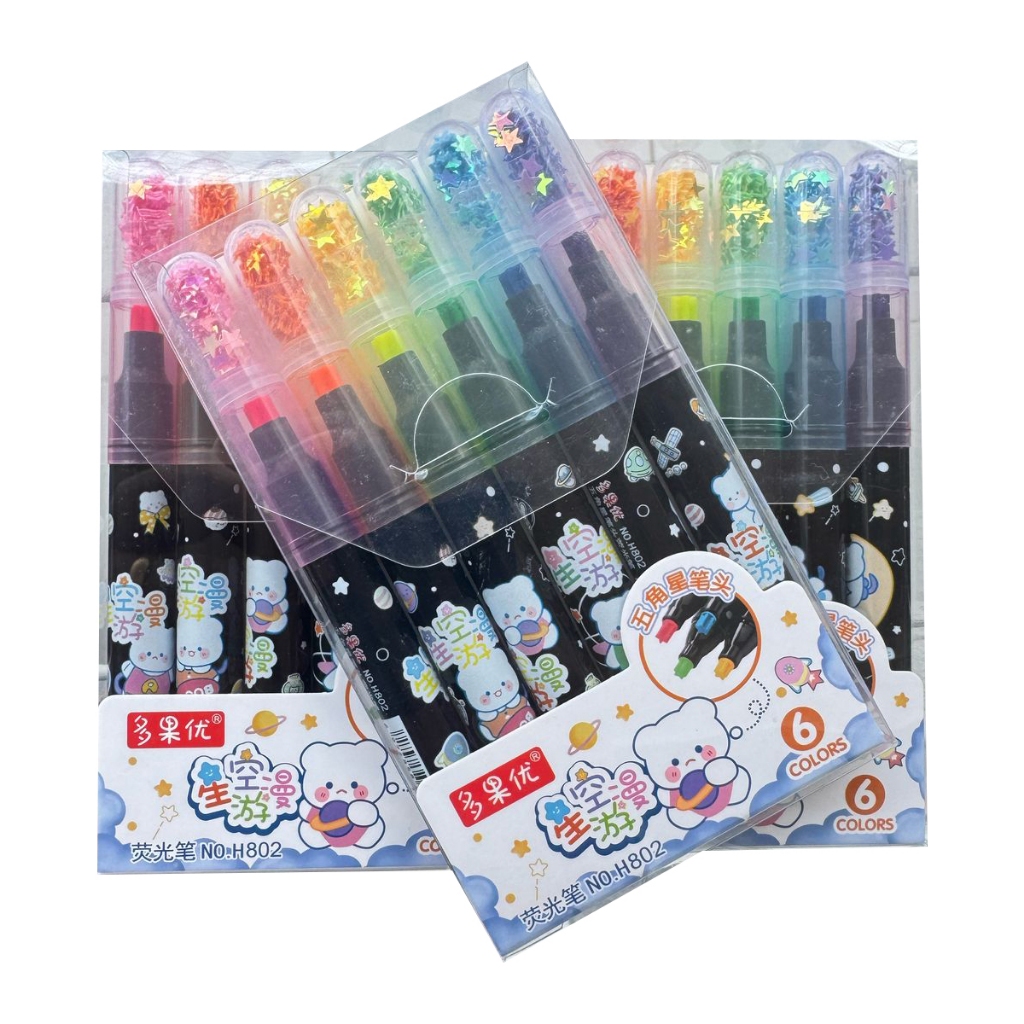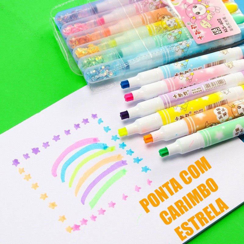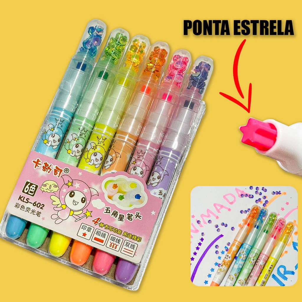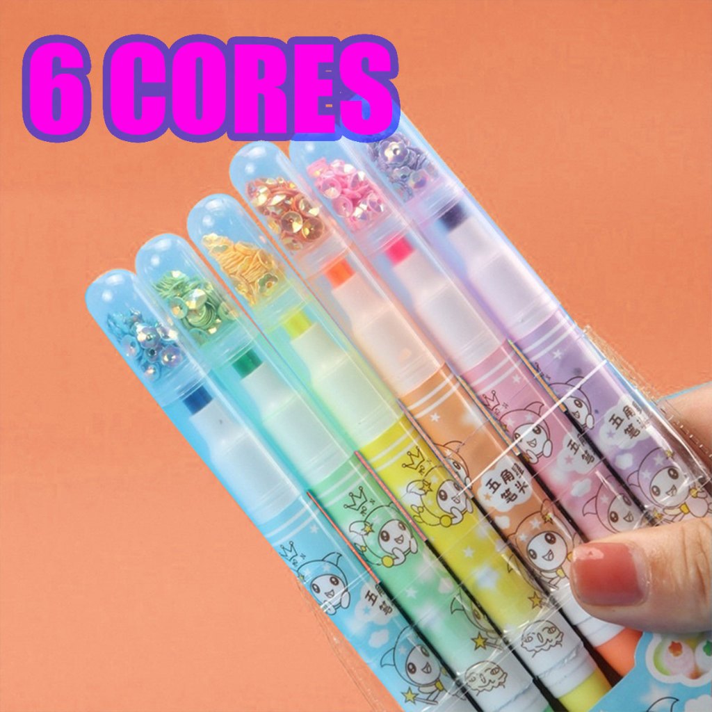Marca Texto fofo e Barato Kit de 6 Ponta em Formato Estrela Carimbo Tampa Lantejoulas Cores Neon