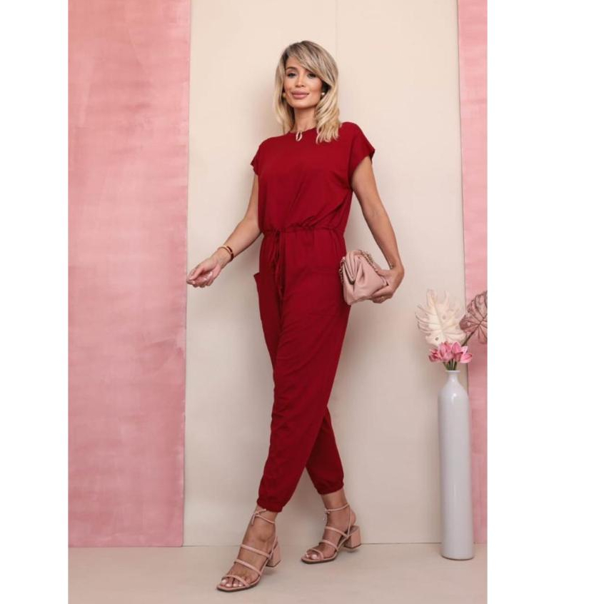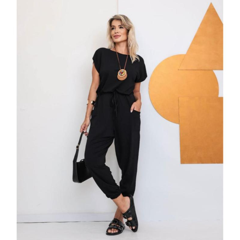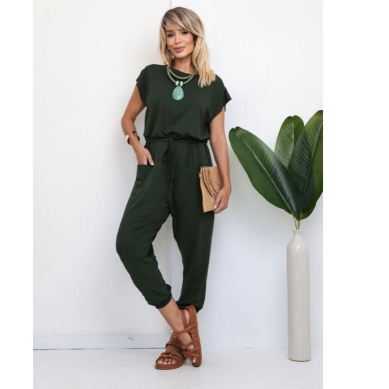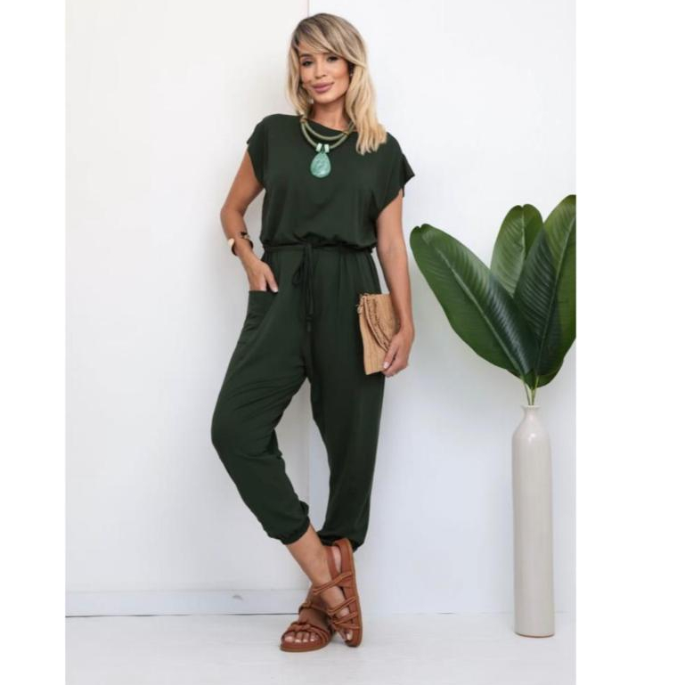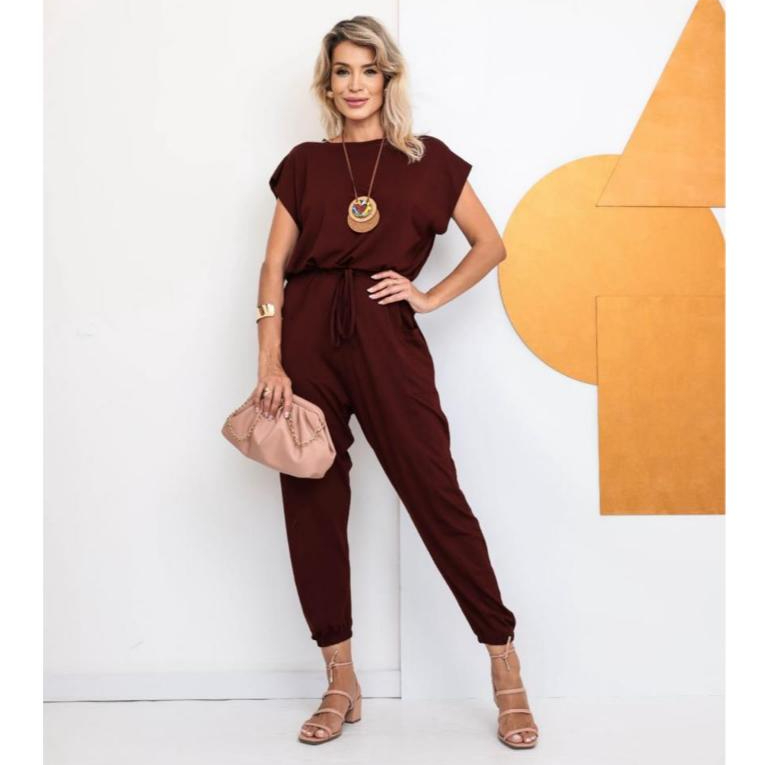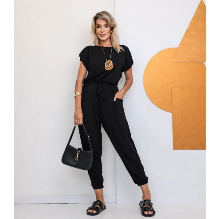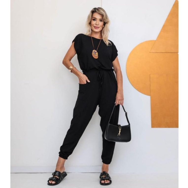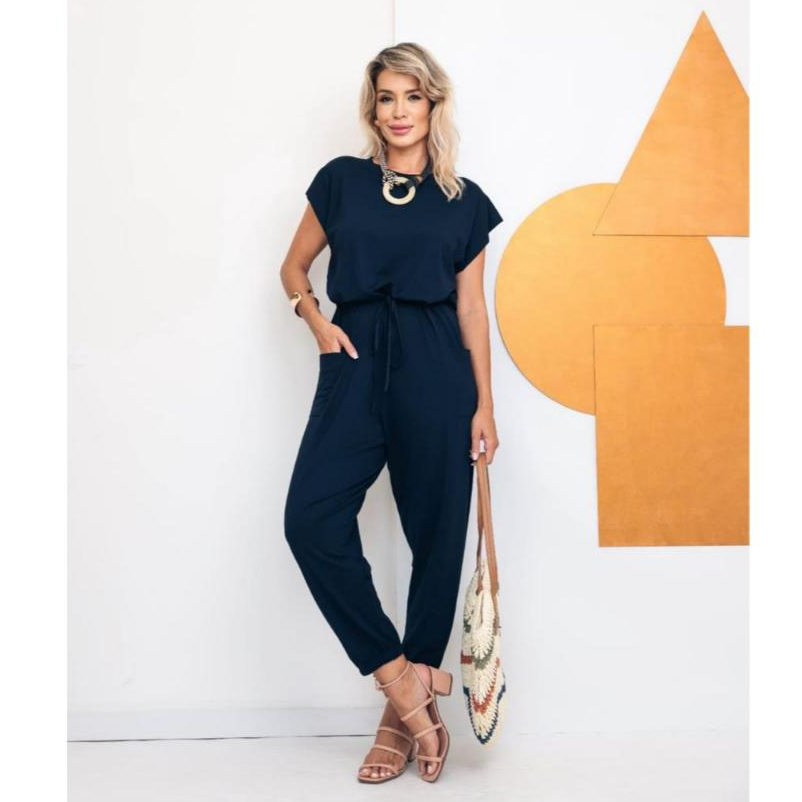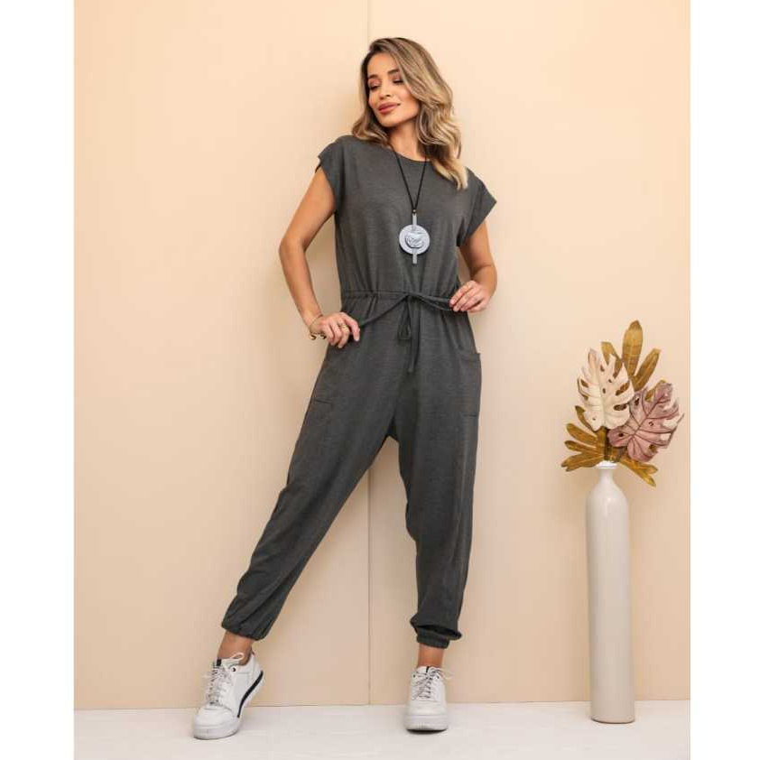 Macacão Saruel Moderno Despojado Longo com manga bolso e ajuste na cintura