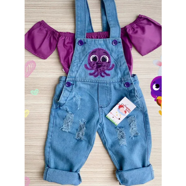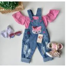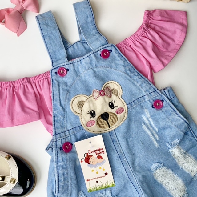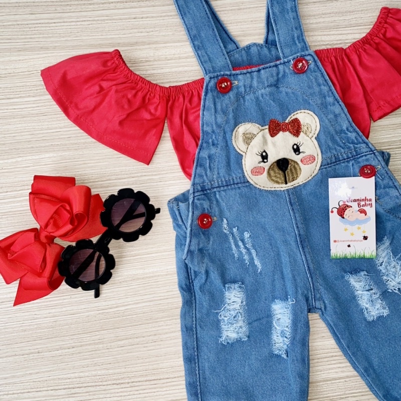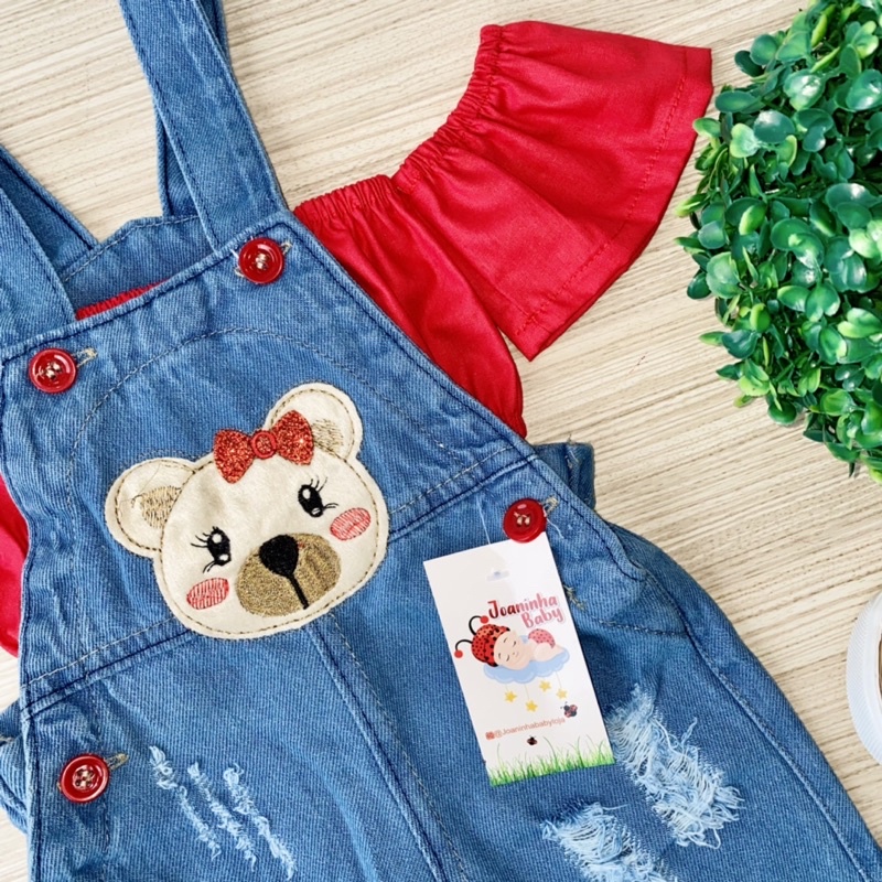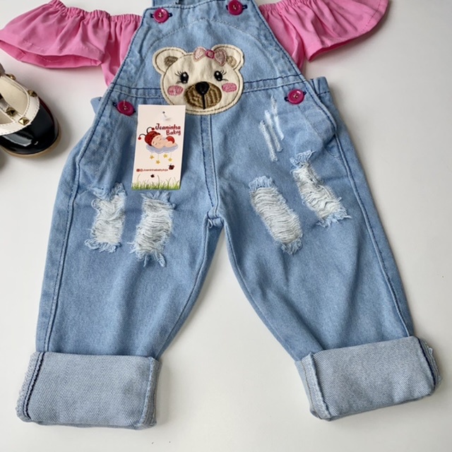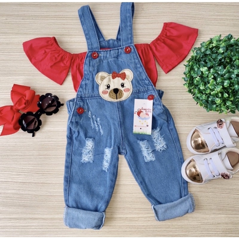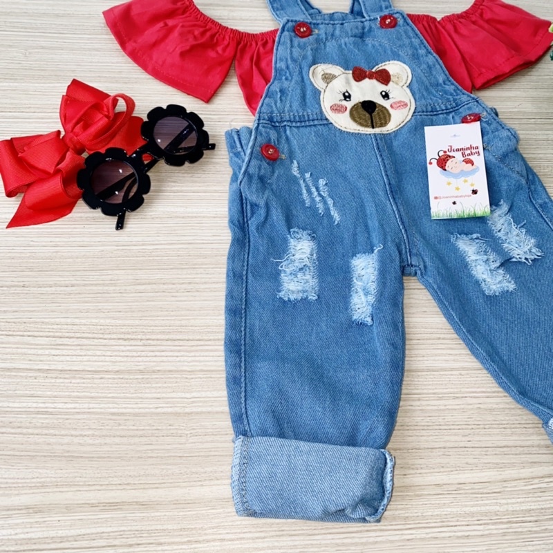 Jardineira Jeans Infantil Ursinha Menina Bebe + Ciganinha