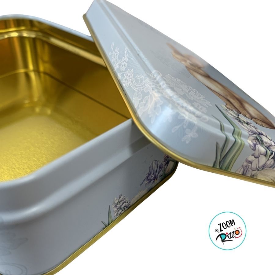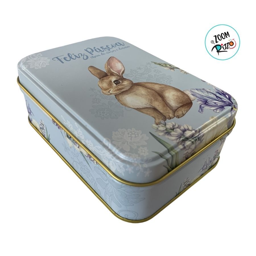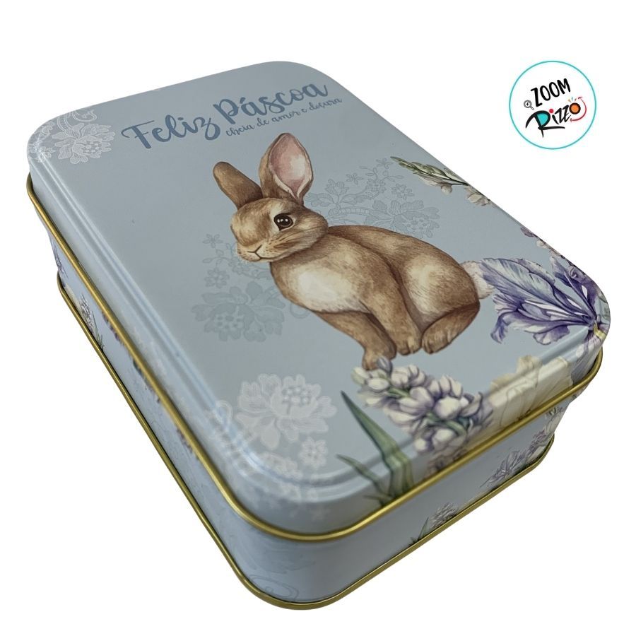 Lata de Metal Retangular de Páscoa - Coelho Flores - Azul - 12,2x8,5x4,5cm - 1 unidade - Rizzo