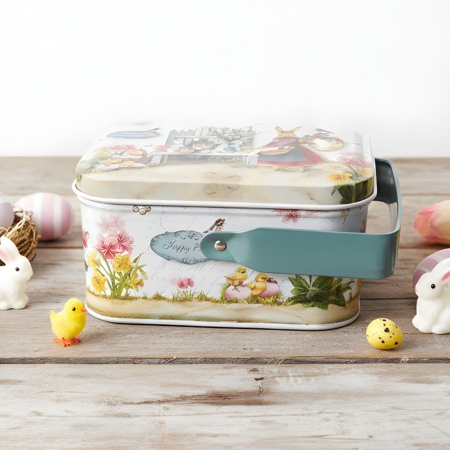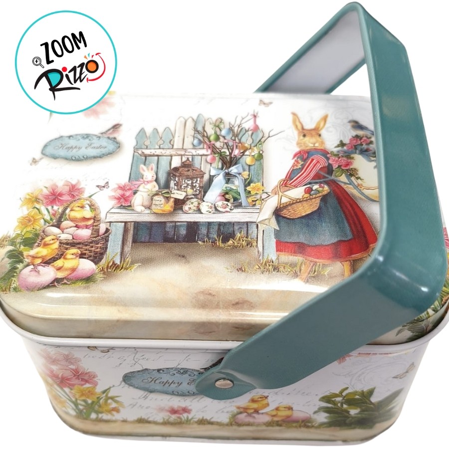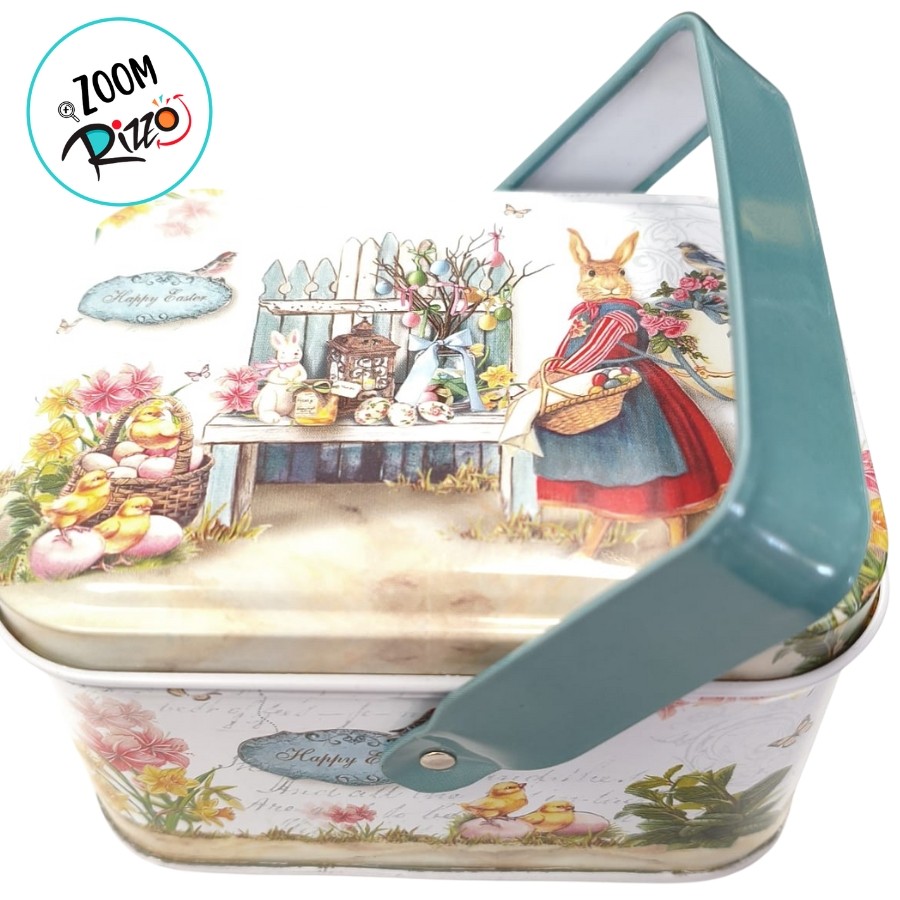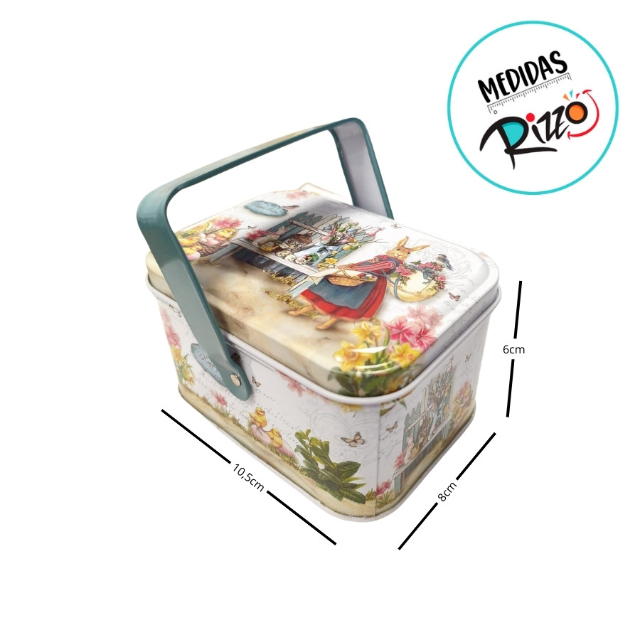 Lata de Metal Retangular com Alça de Páscoa - Coelha de Vestido Vermelho - 10,5x8x6cm - 1 unidade - Rizzo