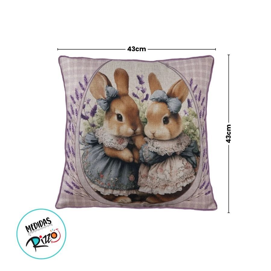 Capa para Almofada de Páscoa Premium - Coelhinhas de Vestido no Campo de Lavanda - Xadrez Lilás - 43x43cm - 1 unidade -