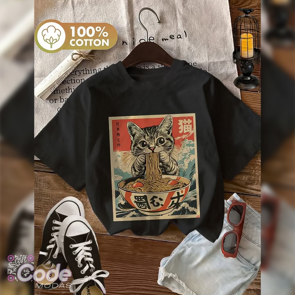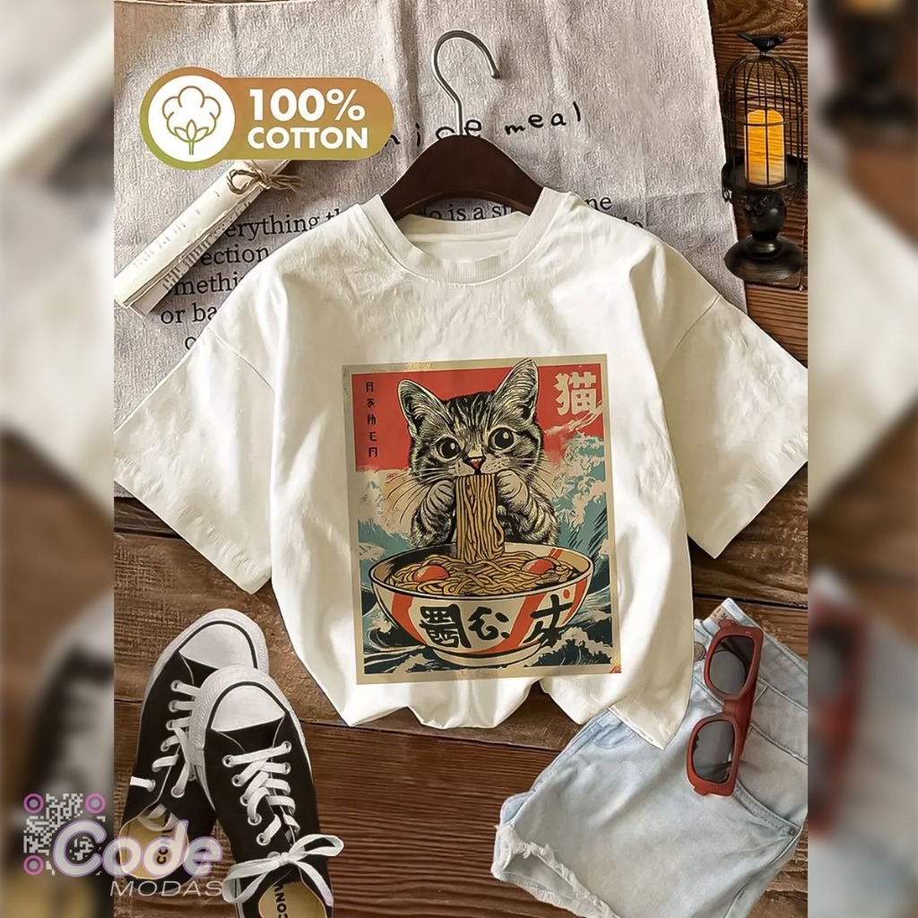 Camisa Camiseta T-Shirt Gato Ramen Japonês Estilo Retrô Algodão Vintage