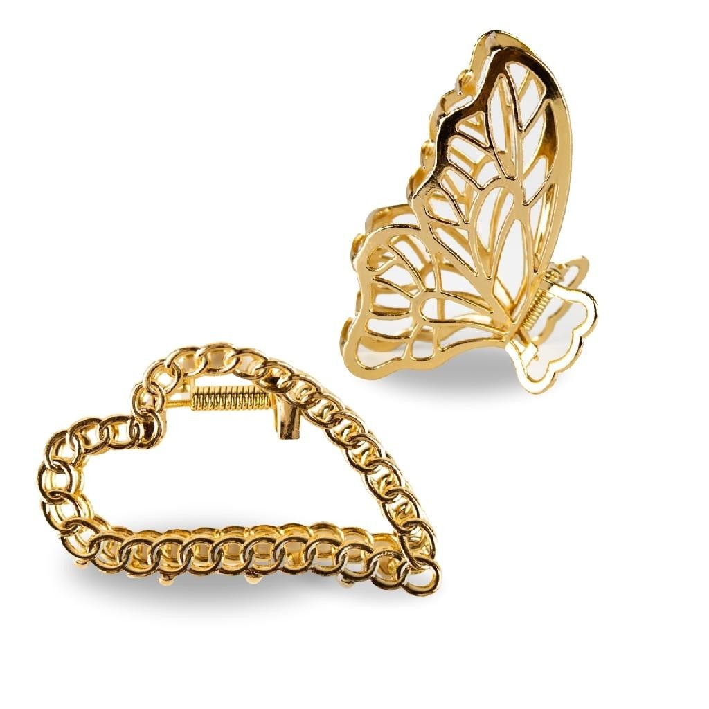 Kit 2 Presilhas Grande Prendedores de Cabelo Metal Dourado Borboleta Coração Penteados Acessório Cabelos