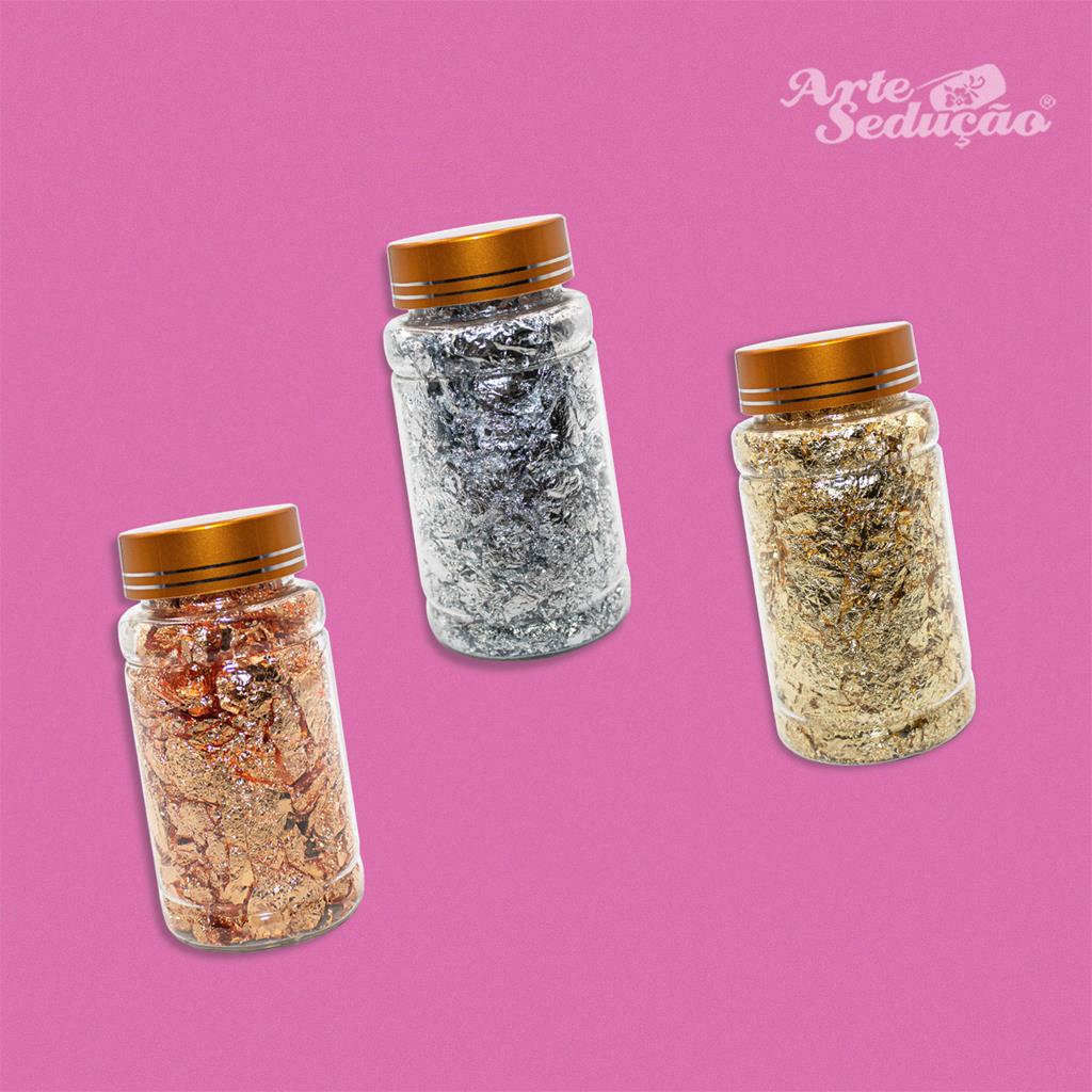 Kit 3 Potes Grandes Folhas de Ouro Dourado Prata Bronze Decoração Unha Nail Enfeite Art Arte Sedução
