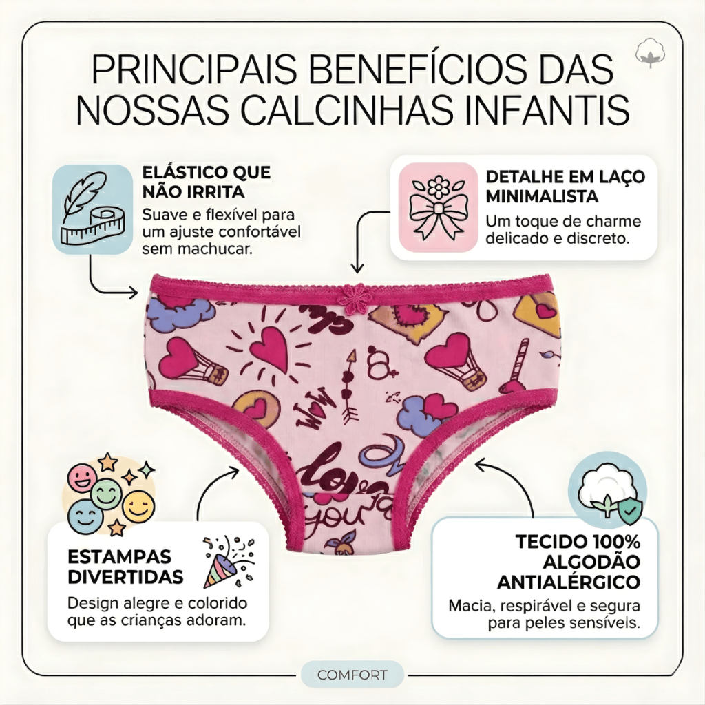 Kit 4 Calcinha Infantil Estampada 100% Algodão Confortável Antialergica Calçolinha Criança Menina