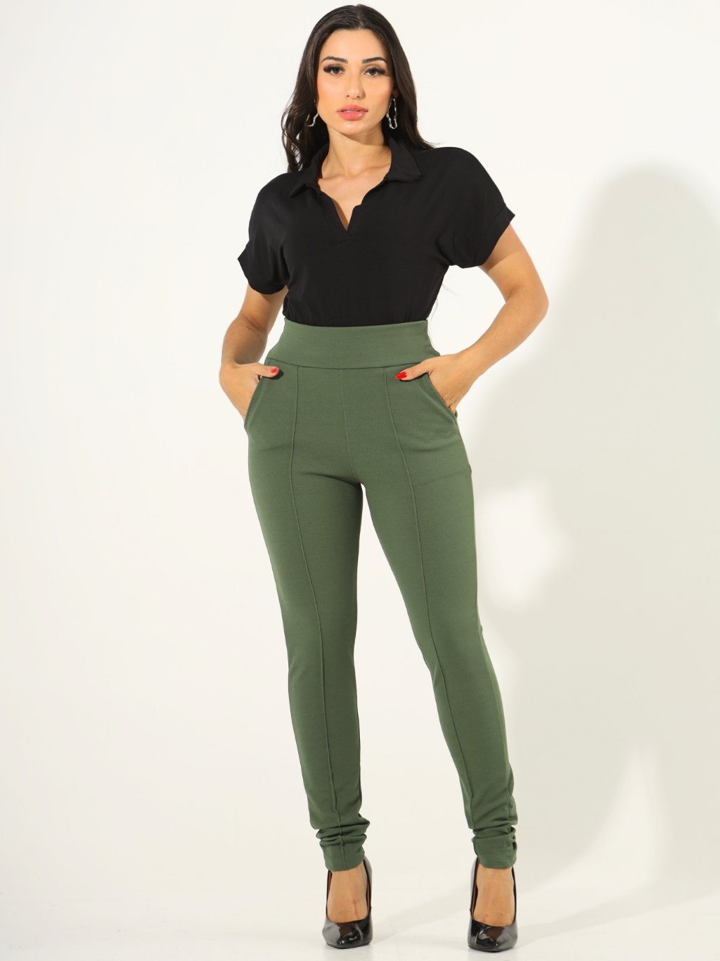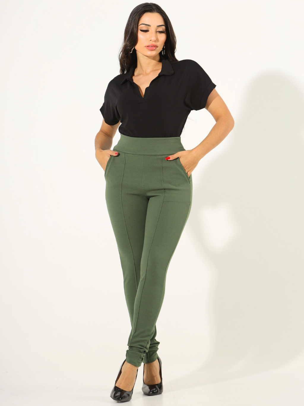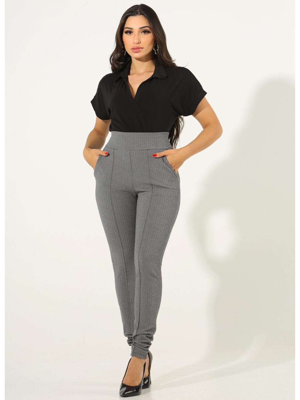Calça Social Malha Crepe Cintura Alta Feminina Bolso Skinny
