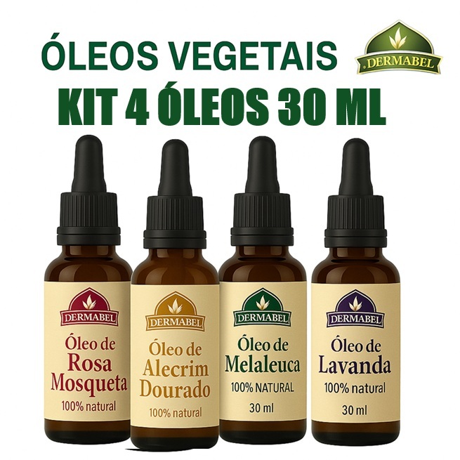 Kit 4 Óleos Melaleuca, Alecrim, Rosa Mosqueta e Lavanda 100% Naturais. Combate Micose, acne Dermabel