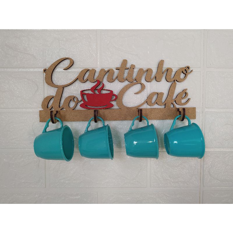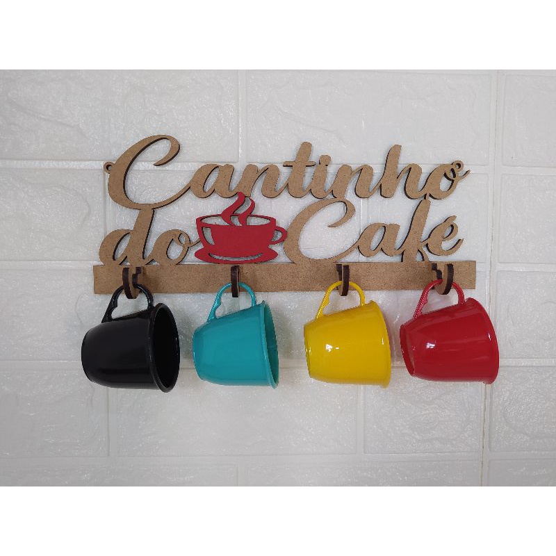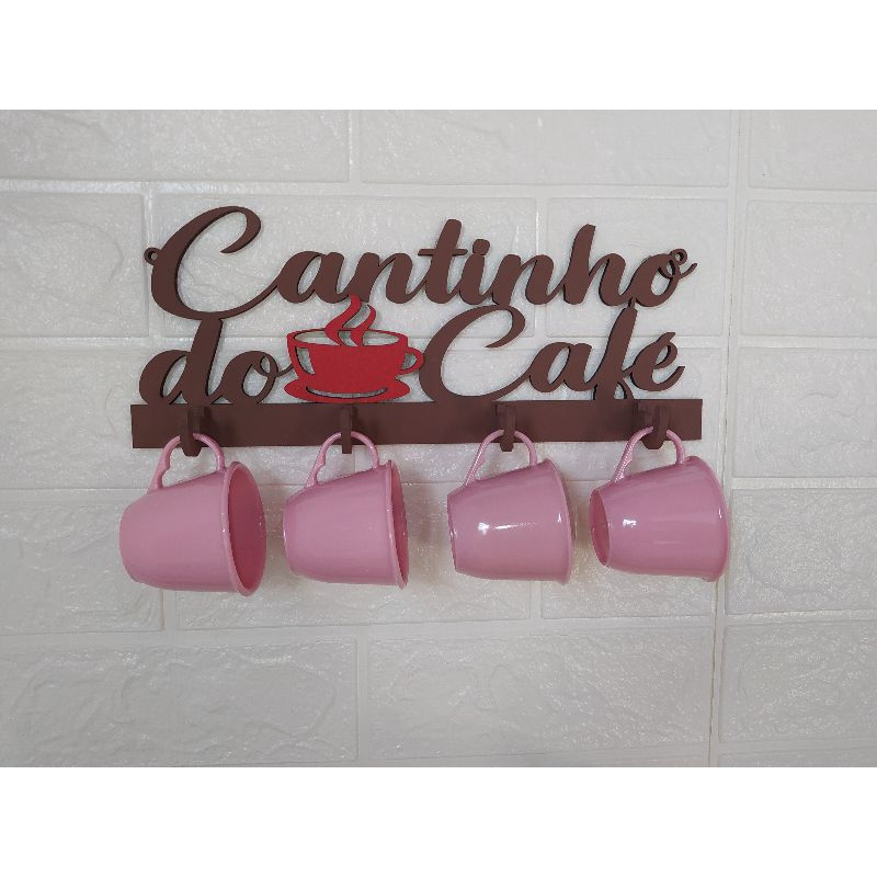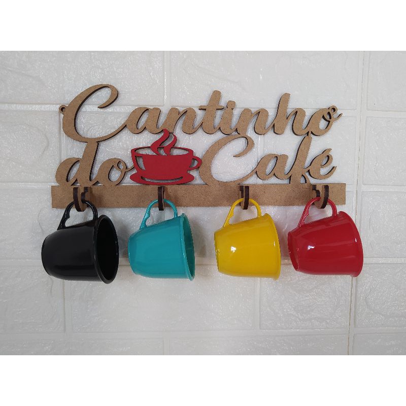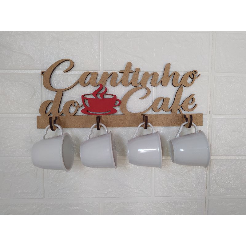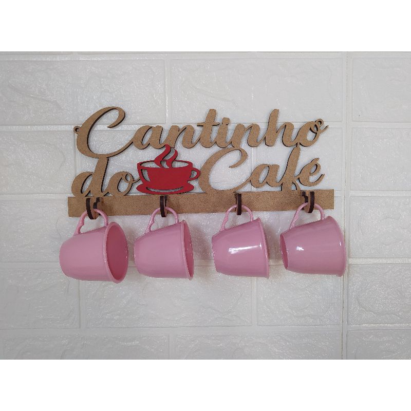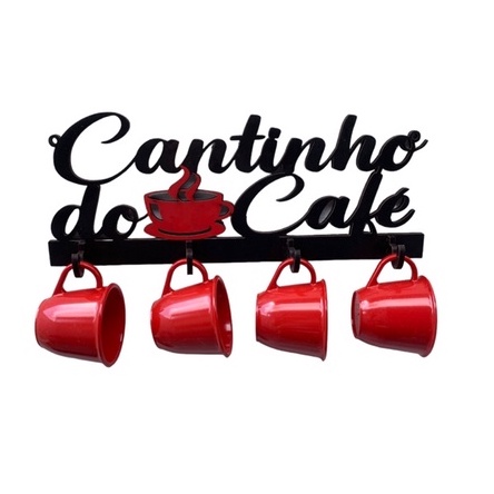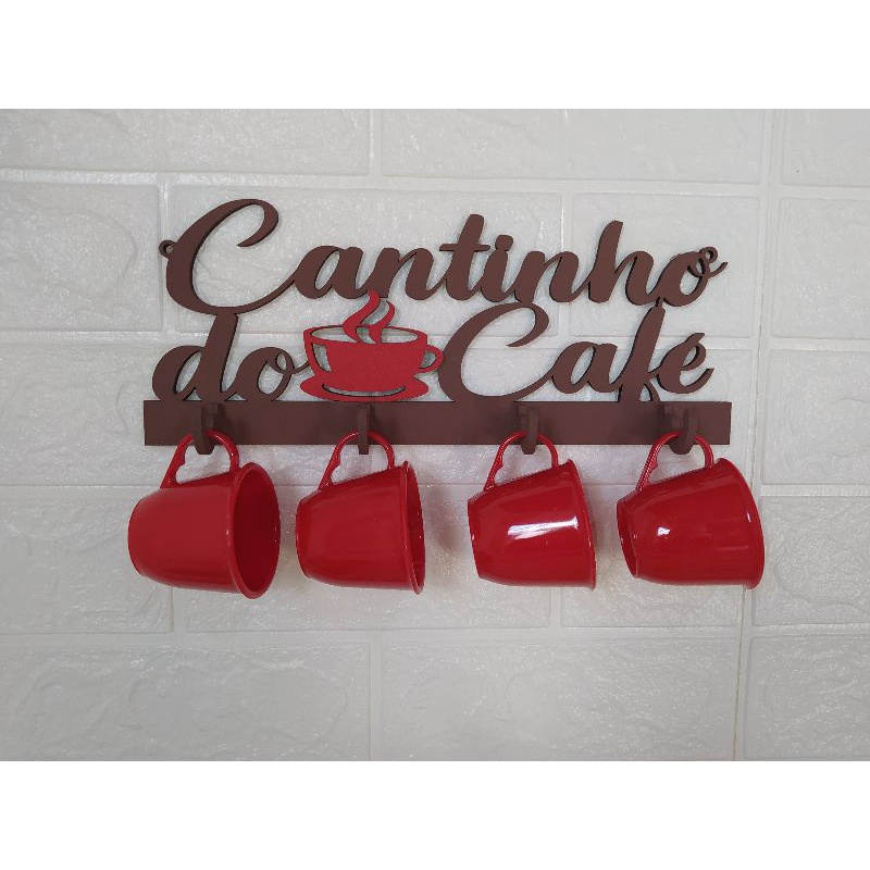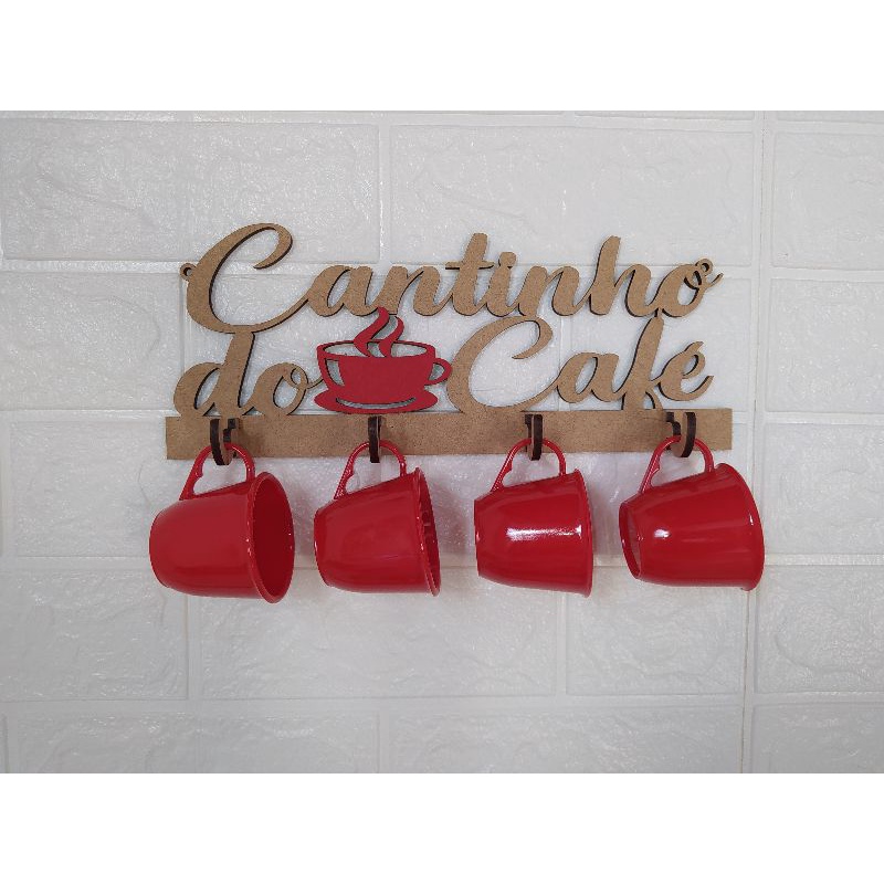 SUPORTE DE MDF PARA XÍCARAS CANTINHO DO CAFÉ COM APLIQUE VERMELHO DE PAREDE COM 4 XÍCARAS DE CAFÉ EM ACRÍLICO COLORIDO 60 ML