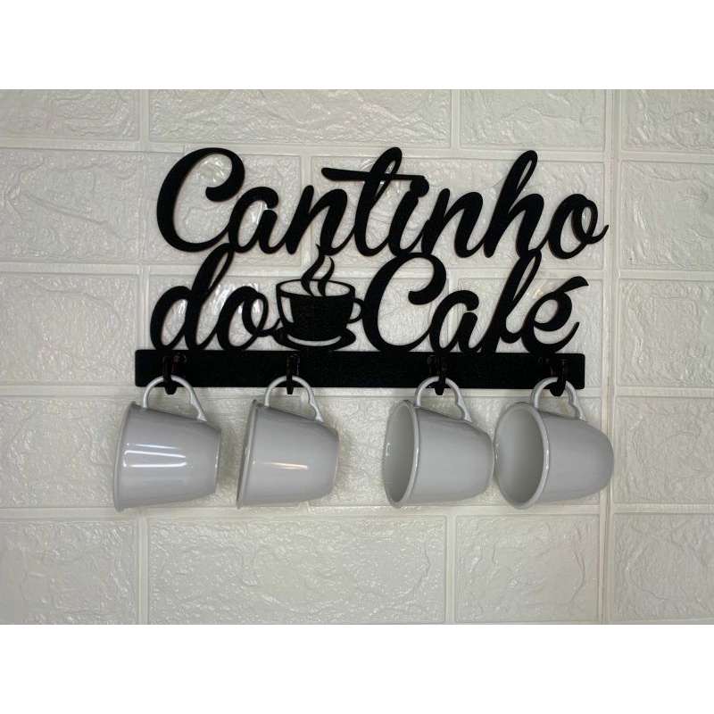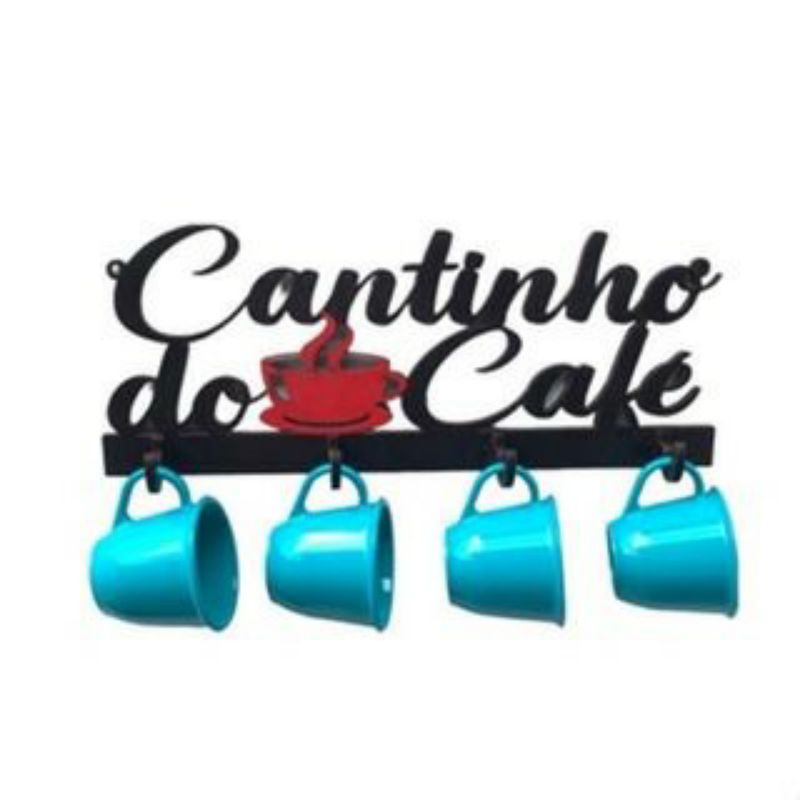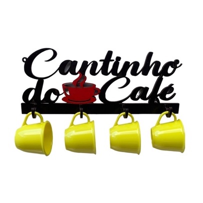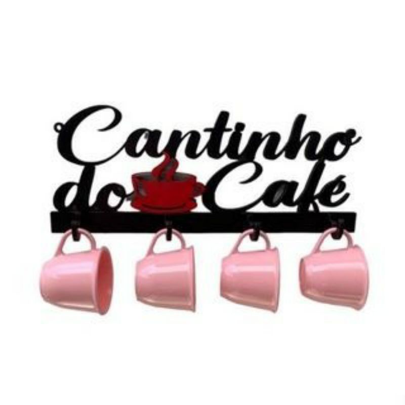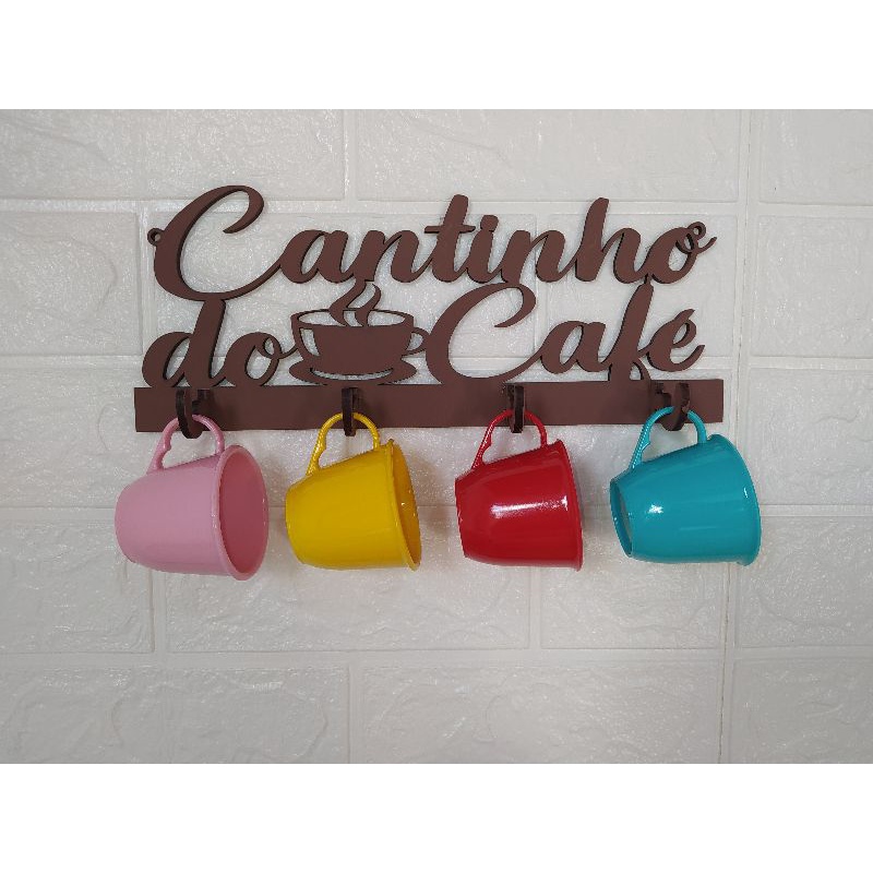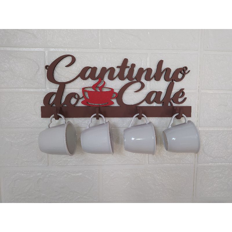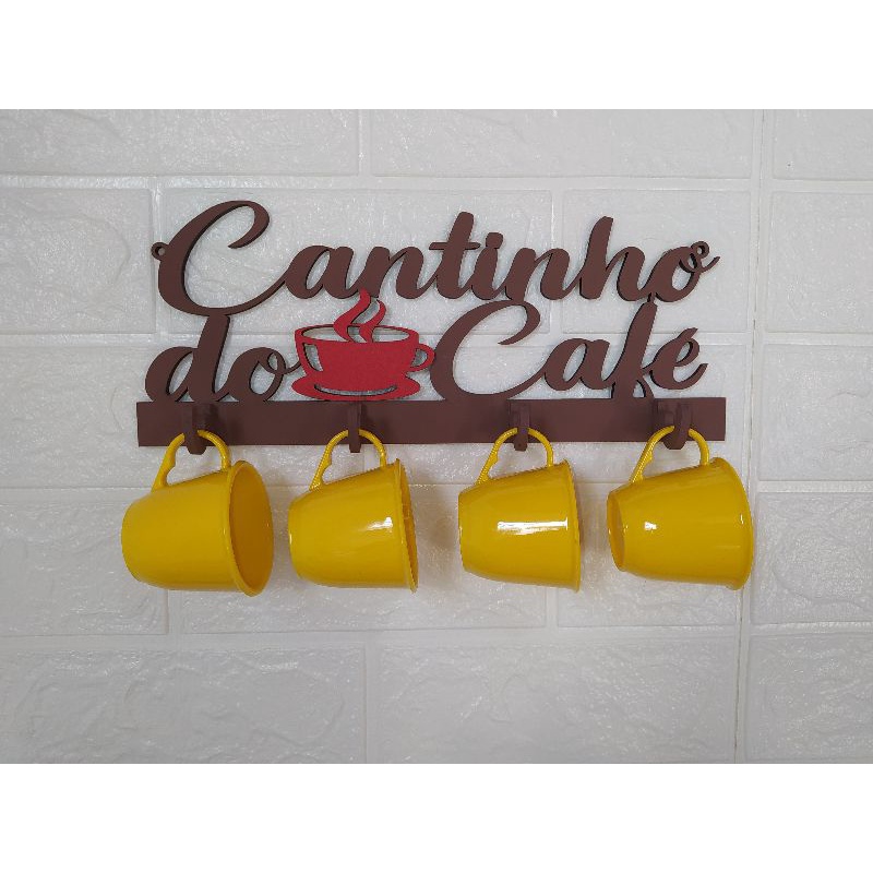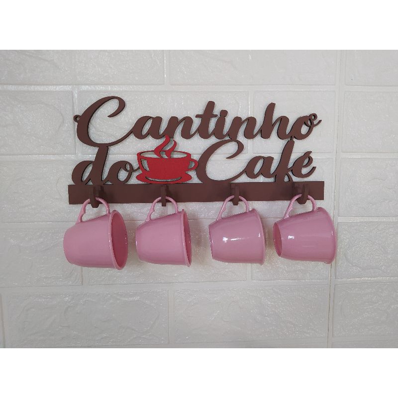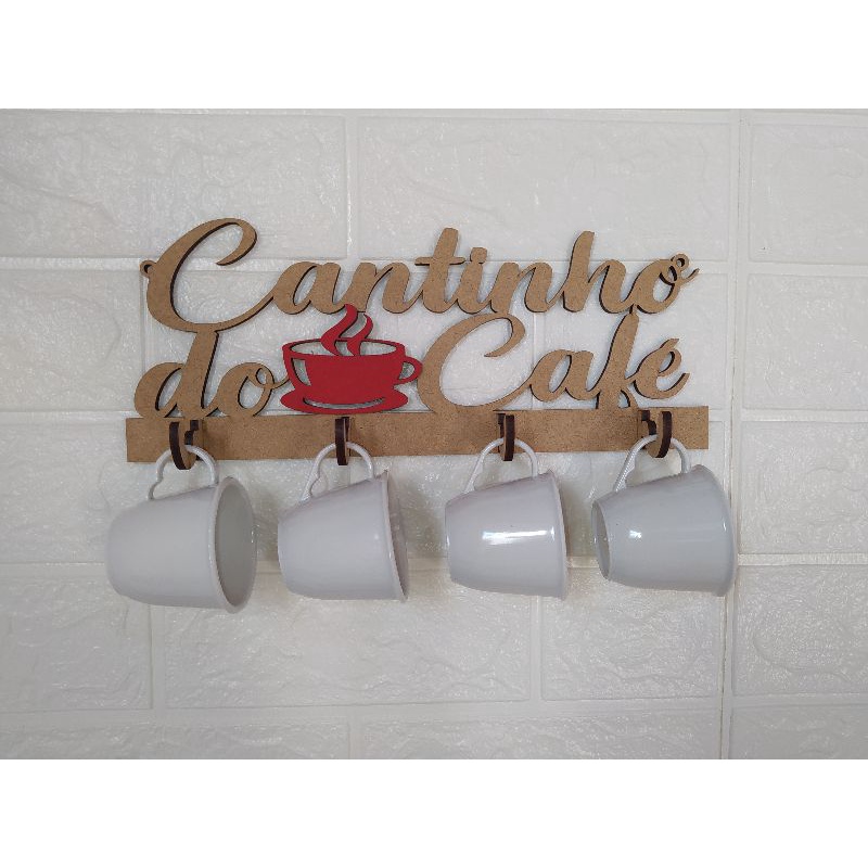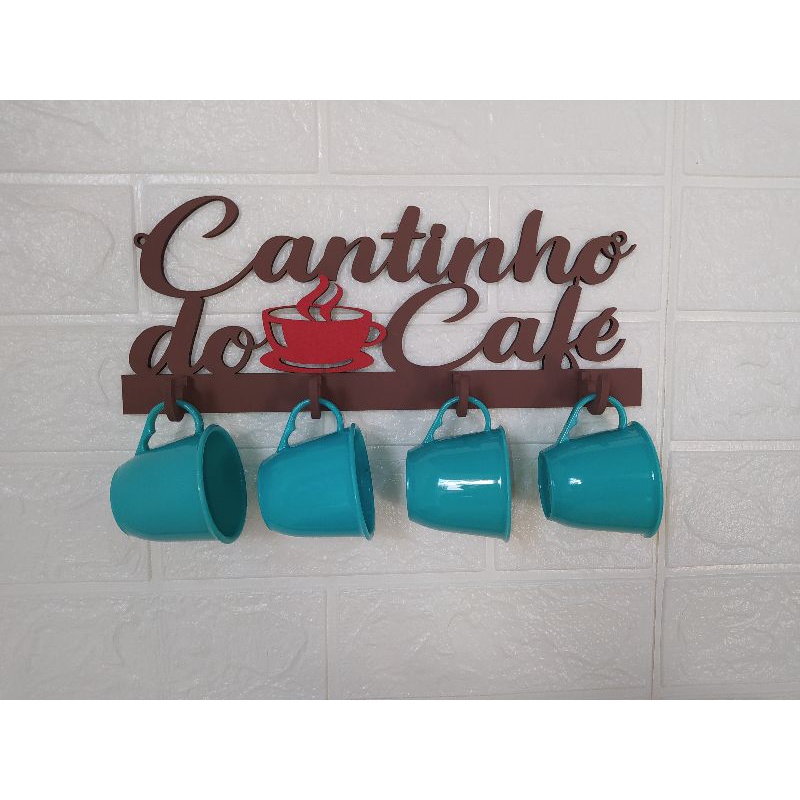 SUPORTE DE MDF PARA XÍCARAS CANTINHO DO CAFÉ COM APLIQUE VERMELHO DE PAREDE COM 4 XÍCARAS DE CAFÉ EM ACRÍLICO COLORIDO 60 ML