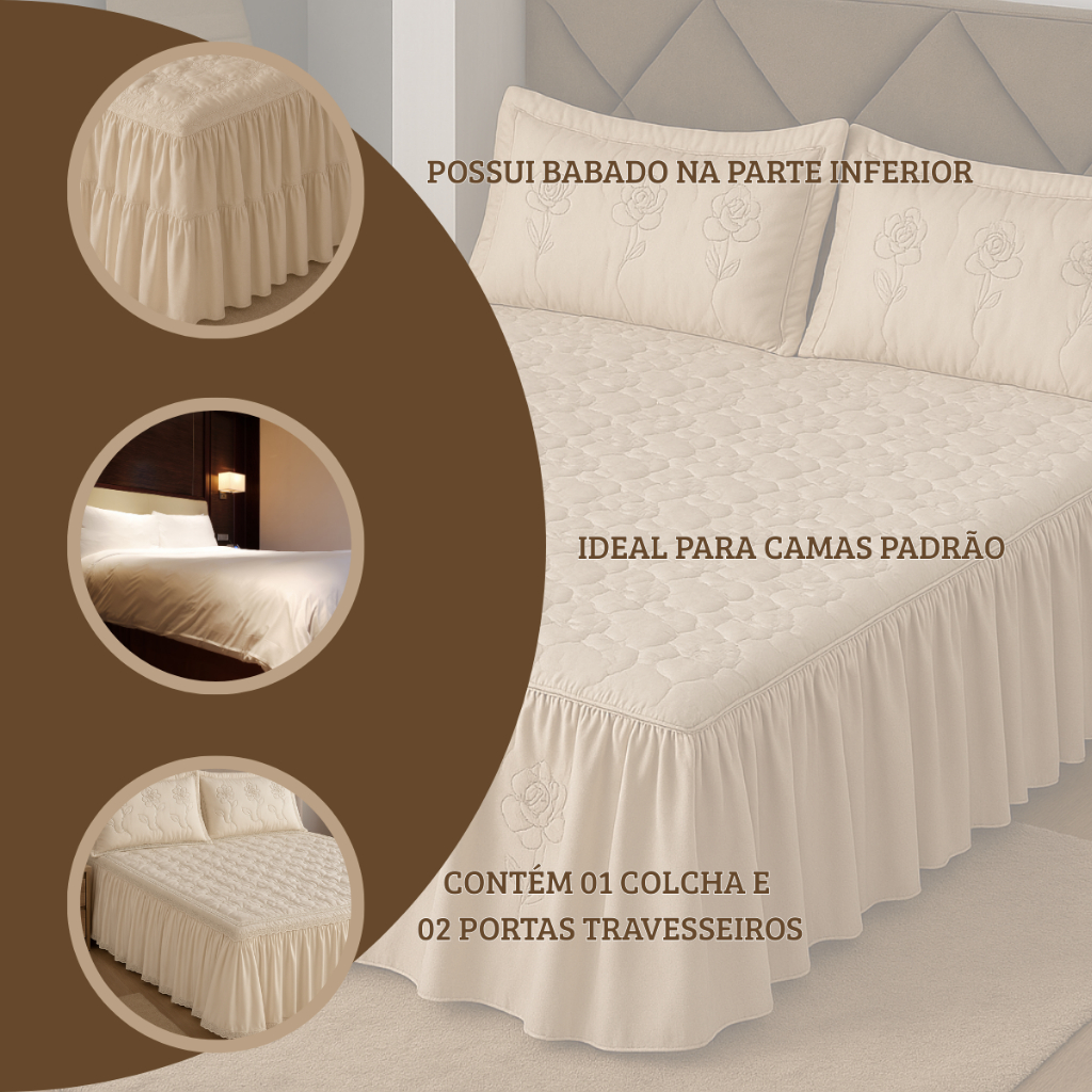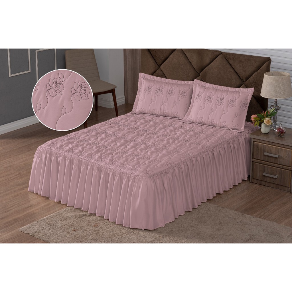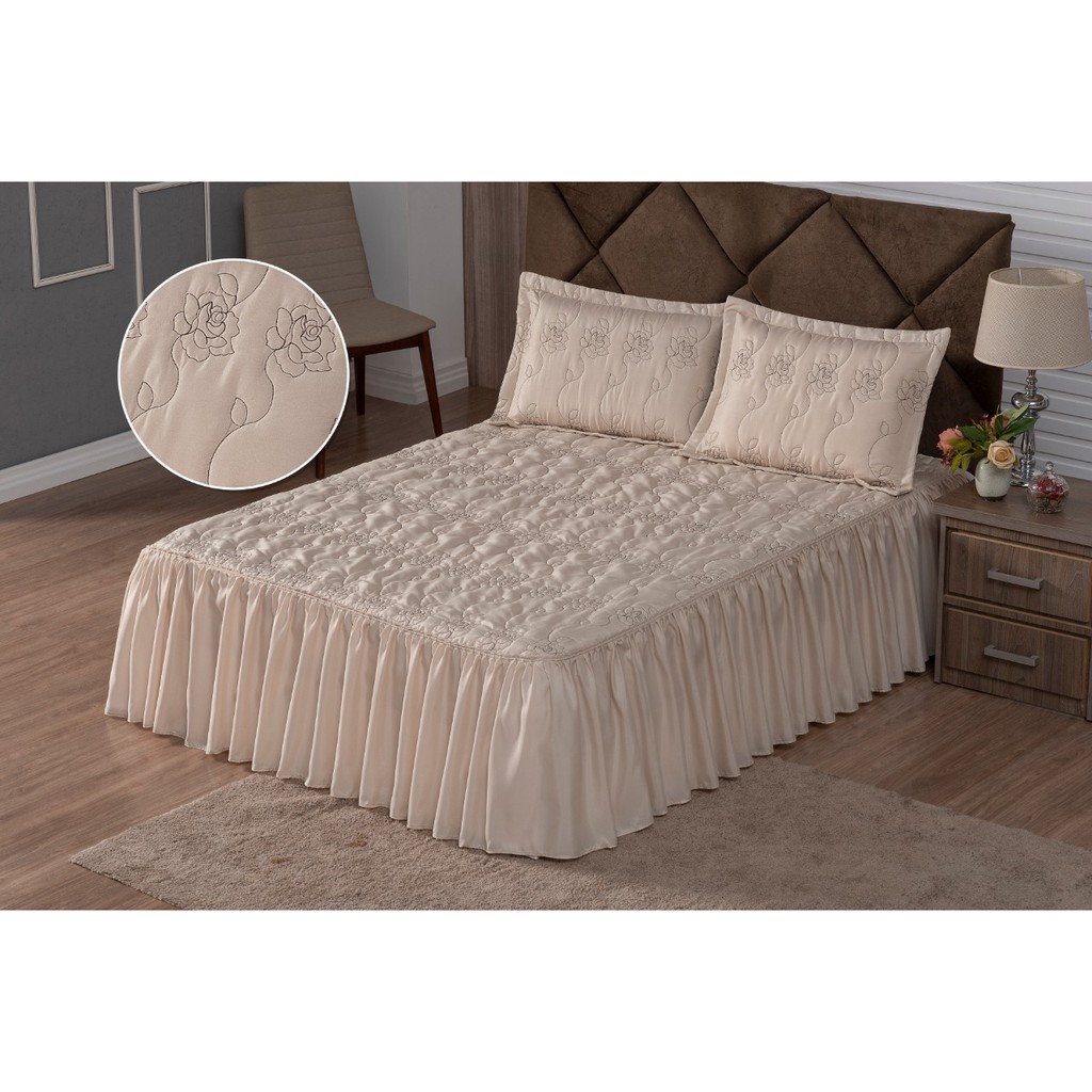 Colcha Casal Bordada Cama Padrao 3 Peças Com Babado