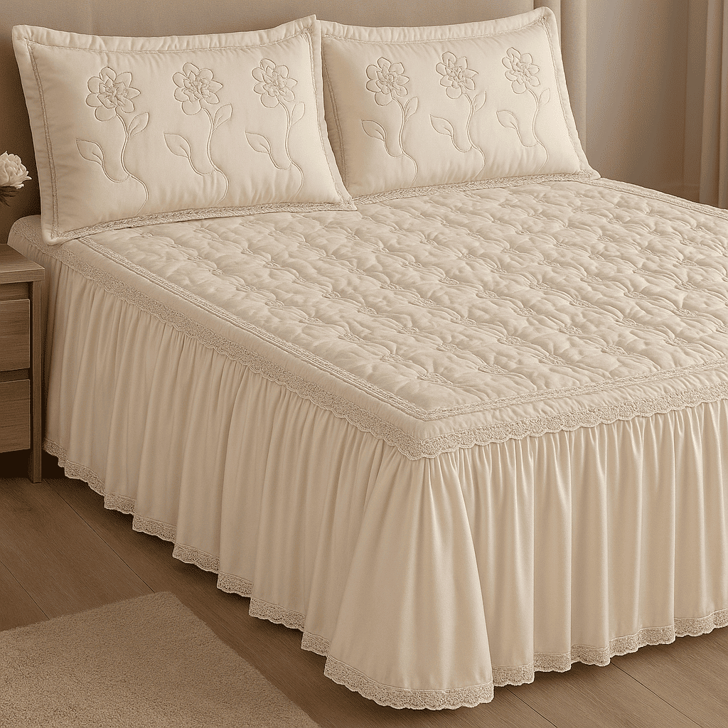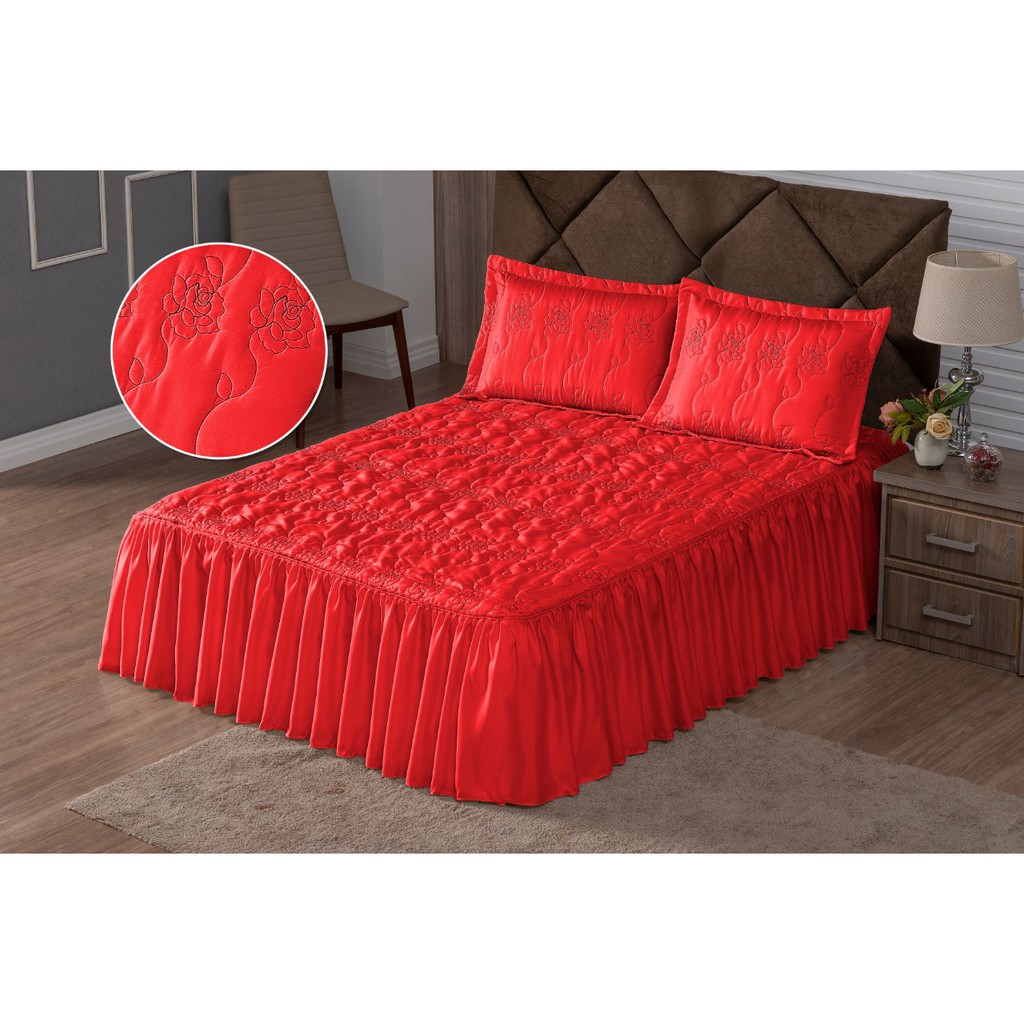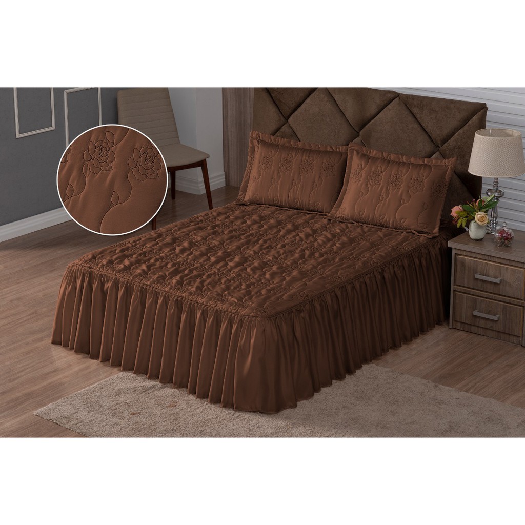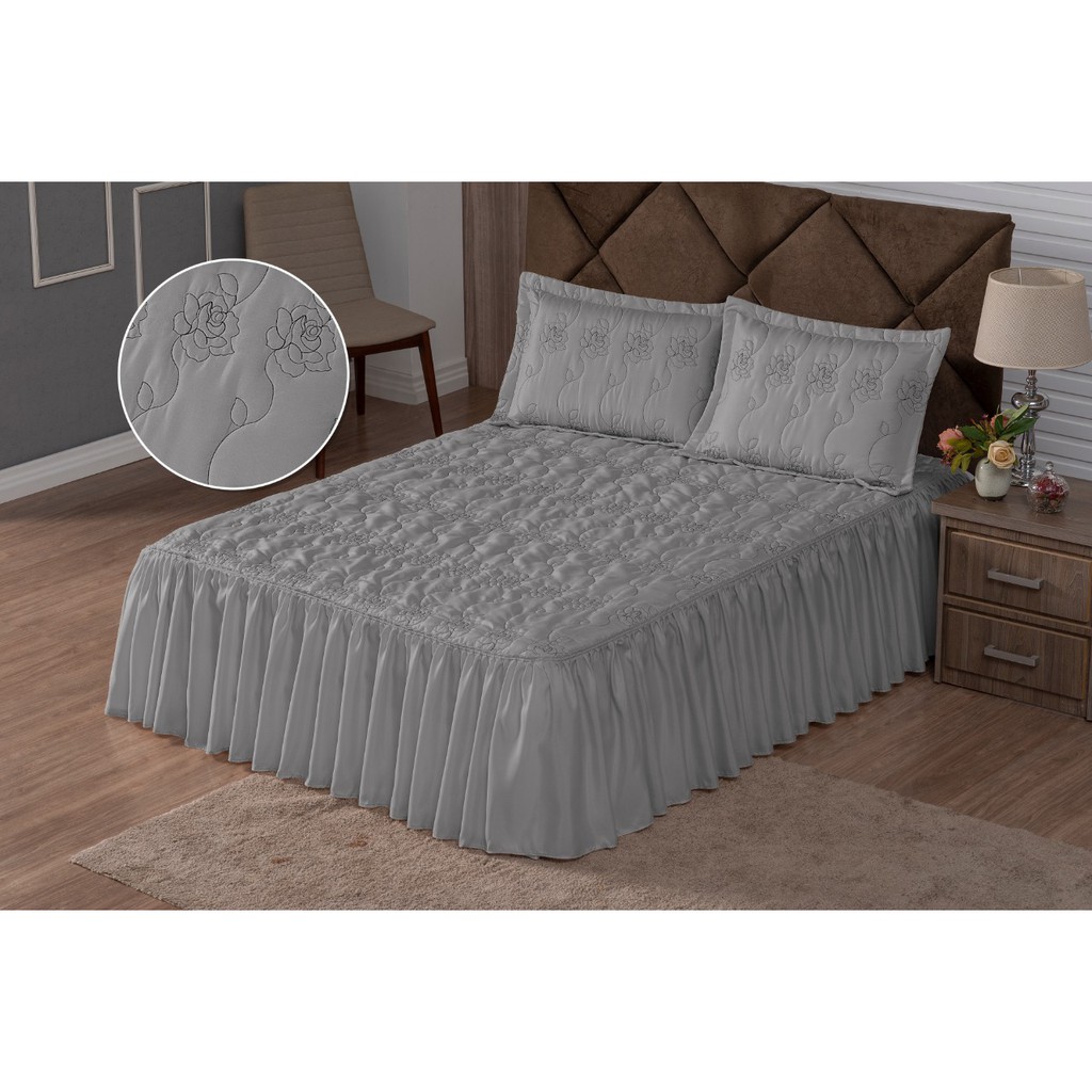 Colcha Casal Bordada Cama Padrao 3 Peças Com Babado