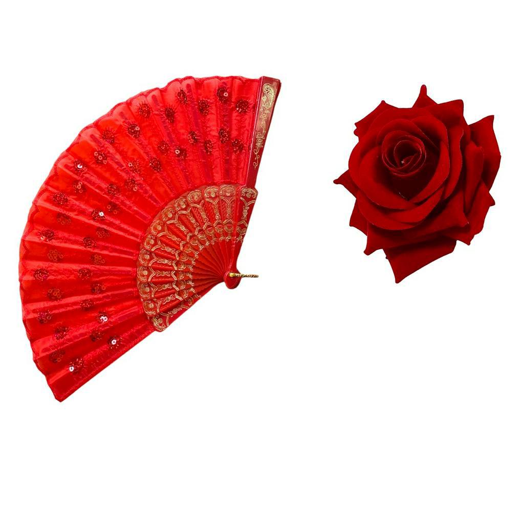 Leque + Rosa de Cabelo Veludo Pomba Gira Ciganas Vermelho