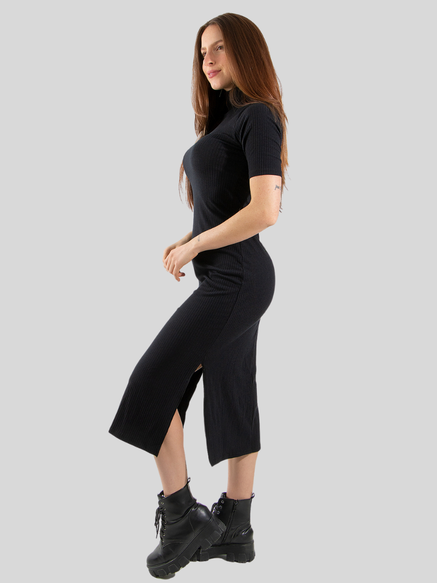 Vestido Feminino Midi Gola Alta Manga Curta Ribana Fenda Lateral