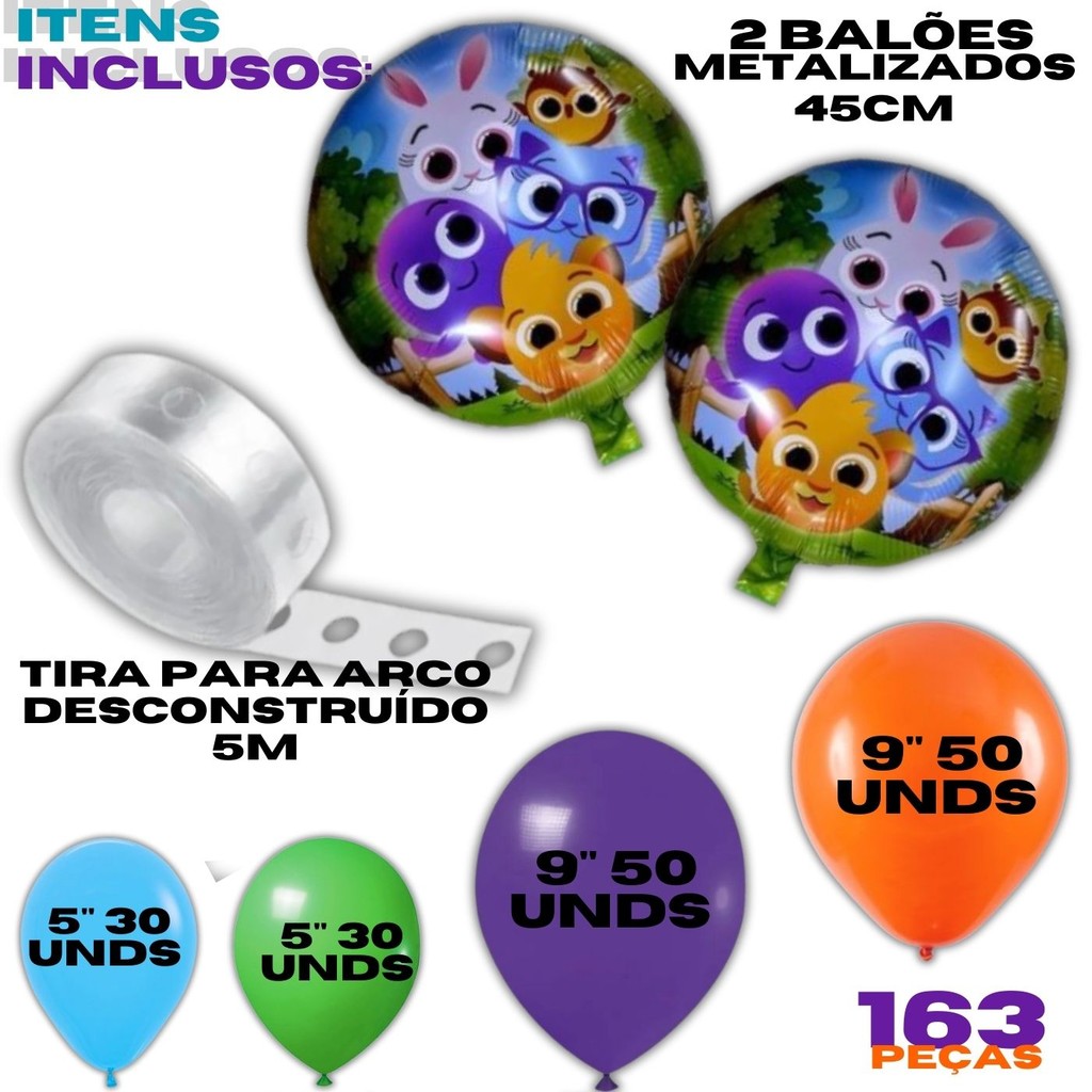 Kit 163pçs - Kit Arco de Balão Bolofofos: 160 Balões Bexigas N9 e N5 + 2 Balões Metalizados + Fita Arco Desconstruído 5m
