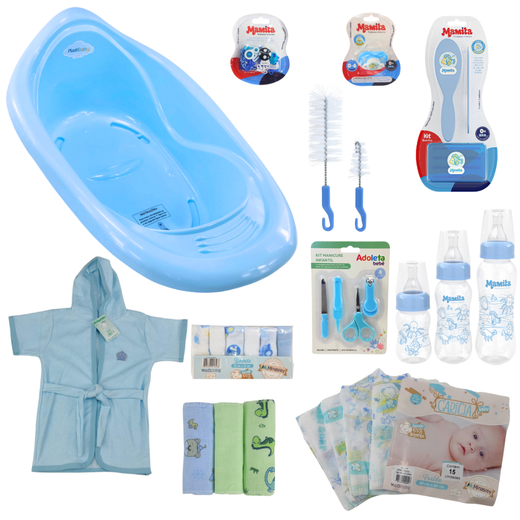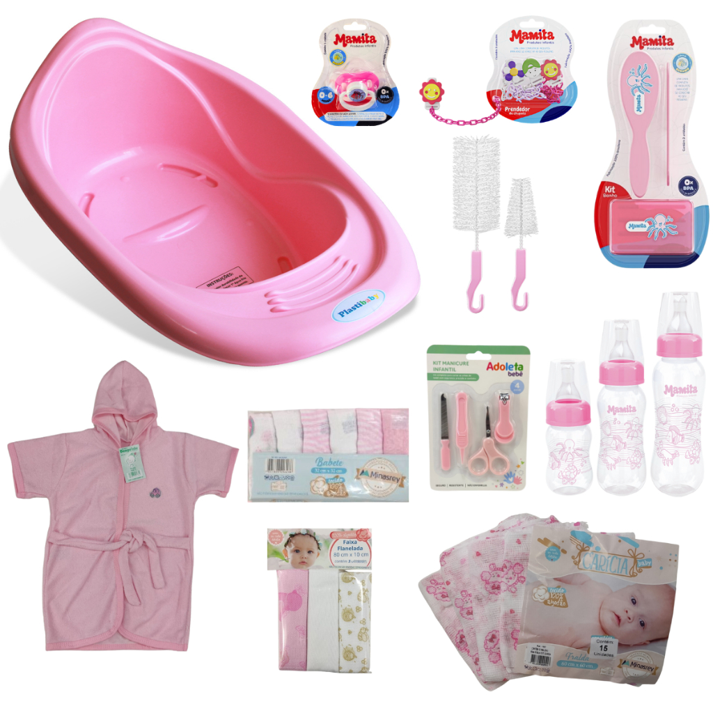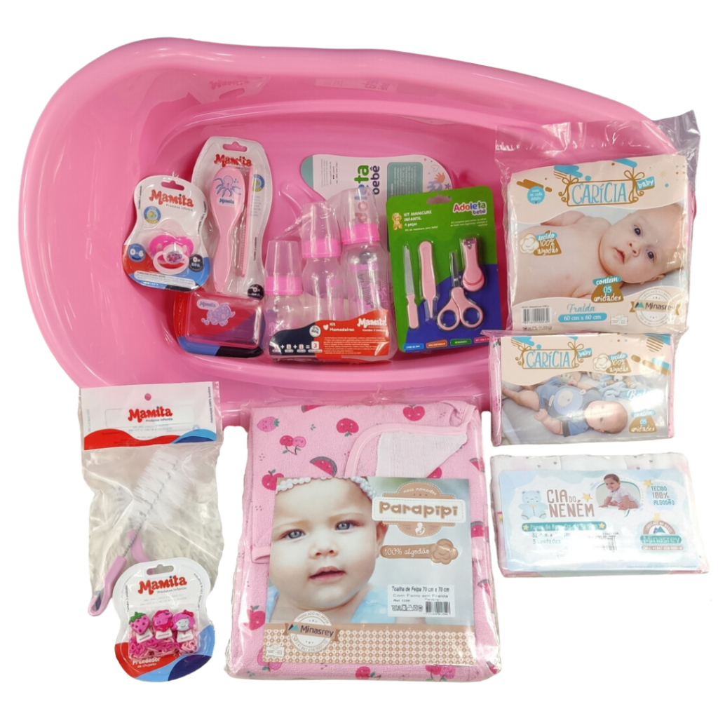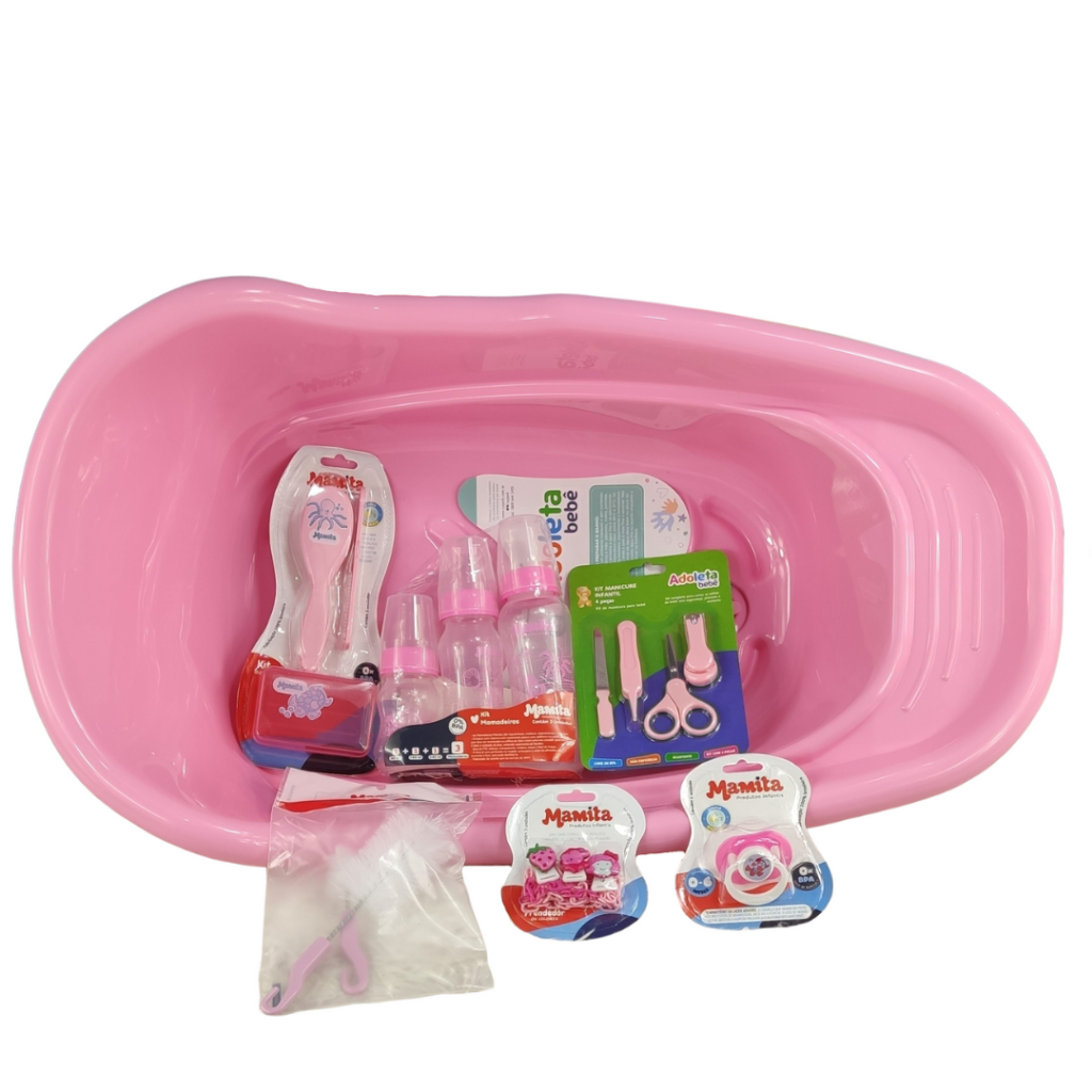 Kit Banheira de Bebê Com Válvula de Escape Chupeta Prendedor + Mamadeira e Vários Itens Para o seu Enxoval - Rosa Menina