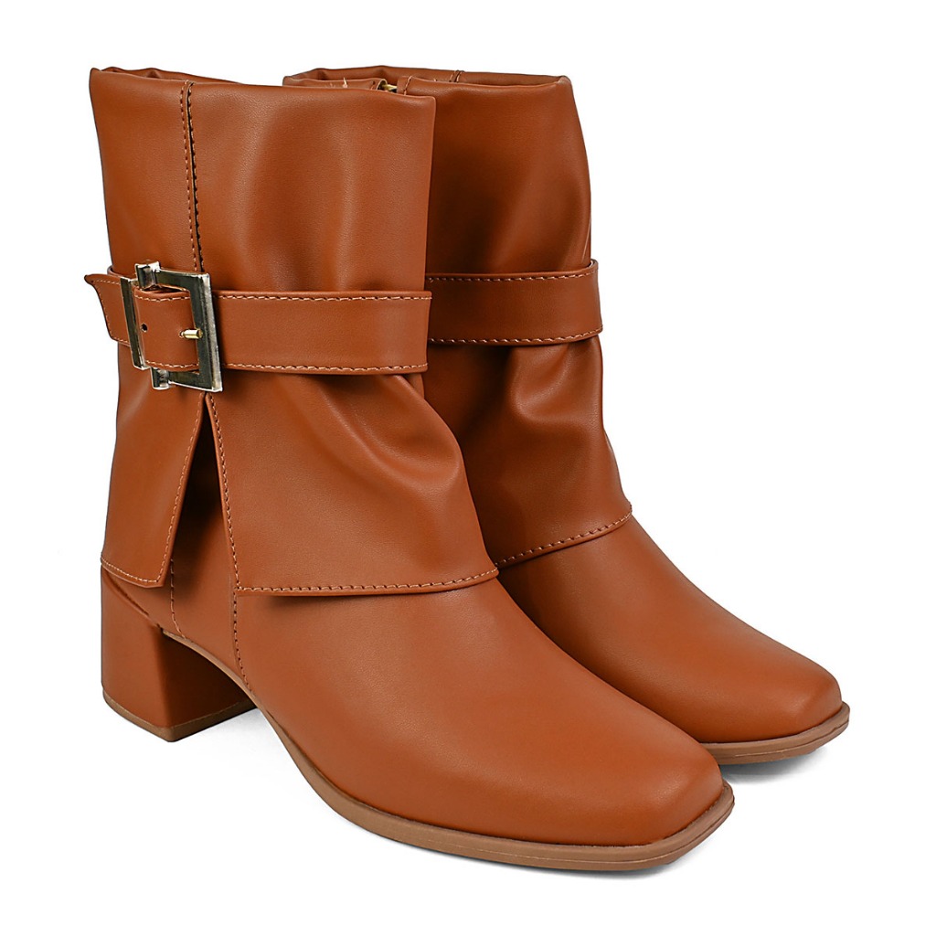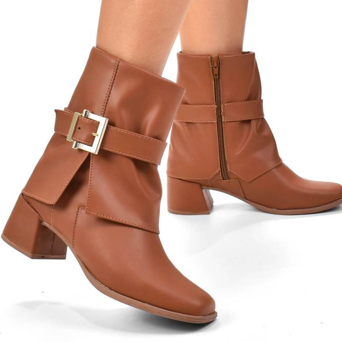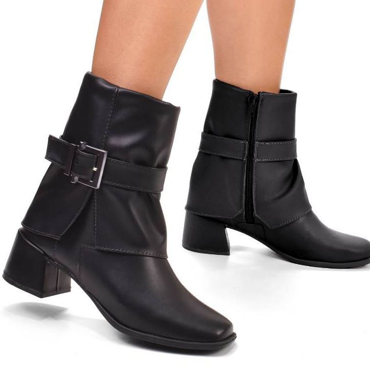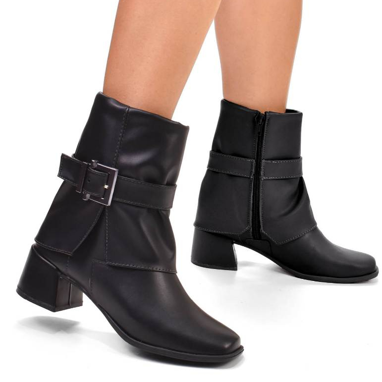 Bota Feminina Capa Salto Bloco 5cm Cano Baixo Fivela Bico Redondo Zíper Lateral Leve Kallys 7855