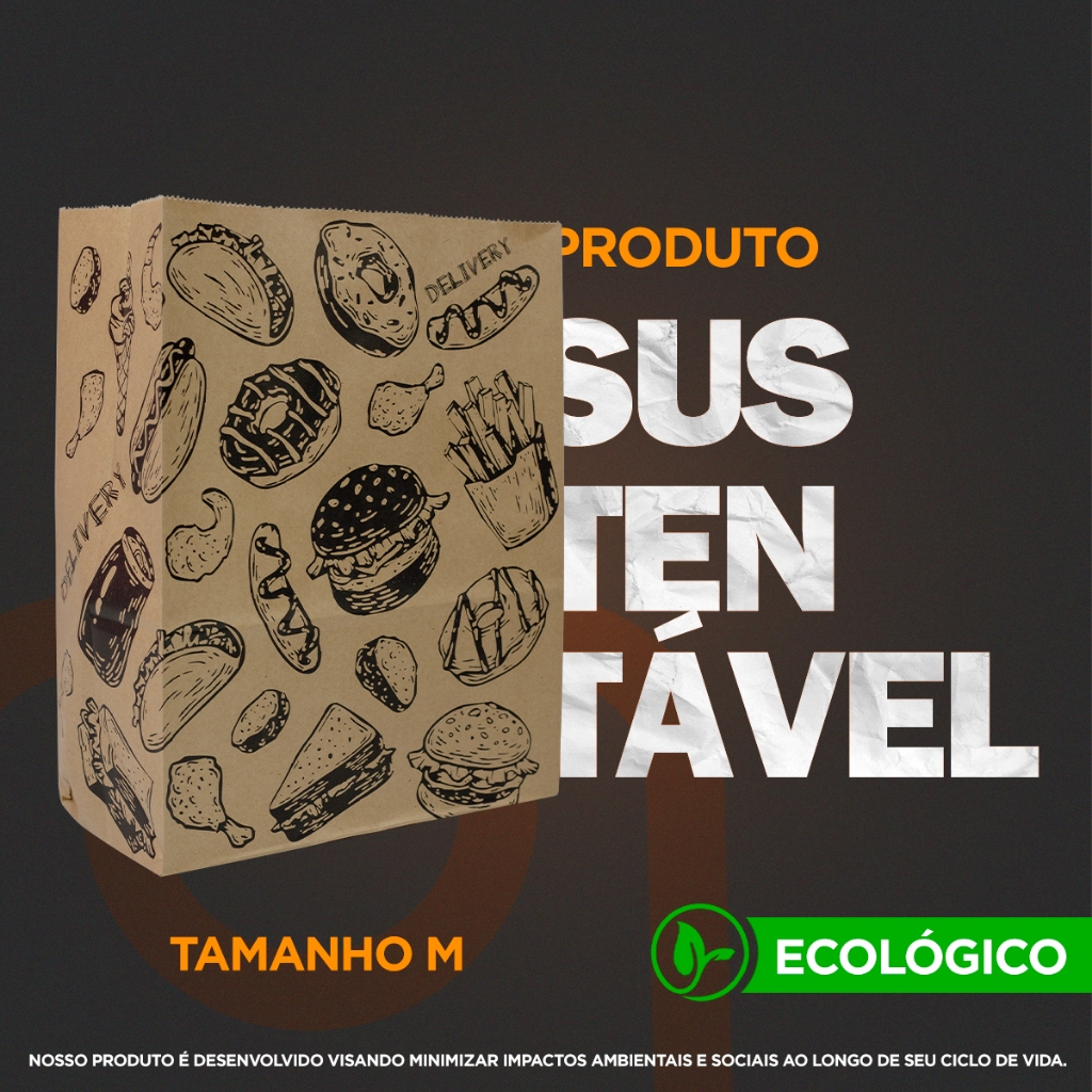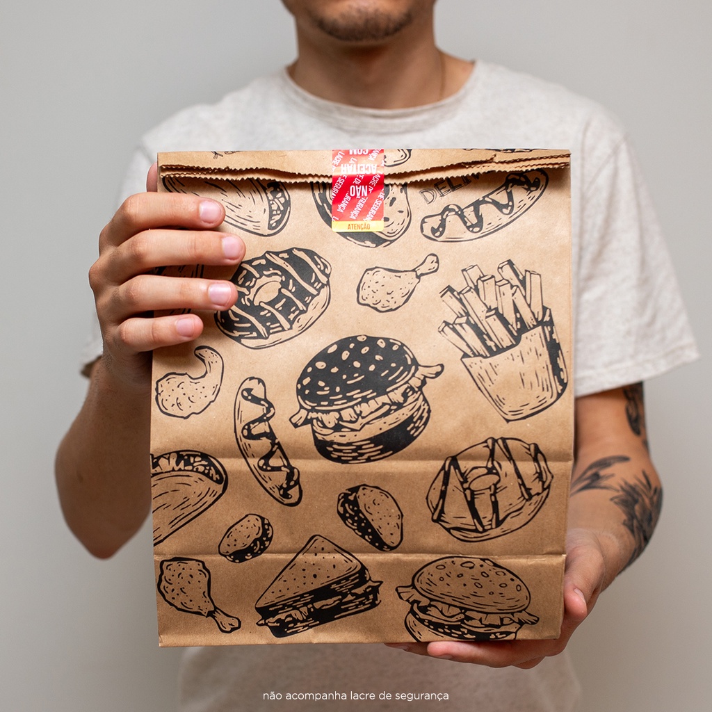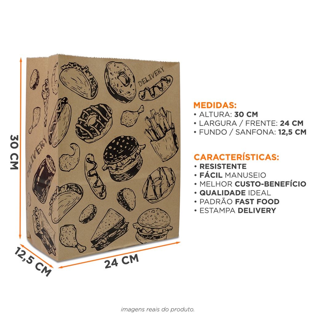 50 Sacos de Papel Kraft 30 x 24 x 12,5 cm Tamanho M Delivery Lanches Comida Entrega Hamburgueria