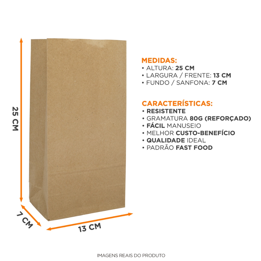 50 Sacos De Papel Kraft 25 x 13 x 7 cm Tamanho PP Delivery Hamburguer Lanches