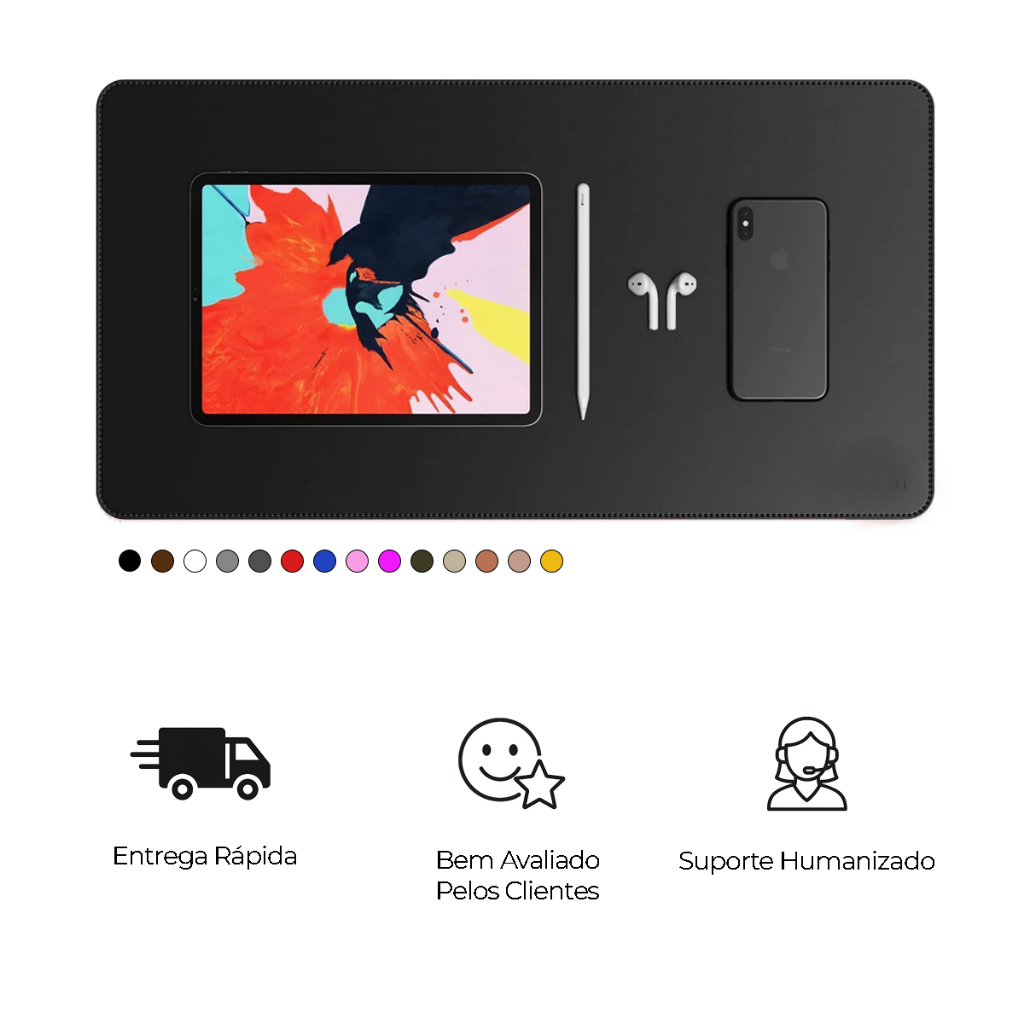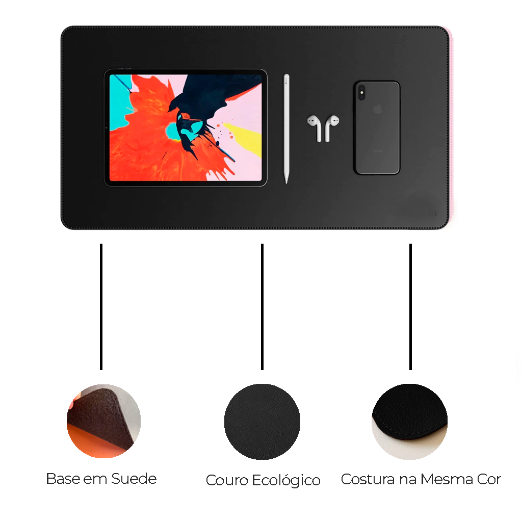 Mouse Pad Grande Couro Preto Feltro Costurado Básico