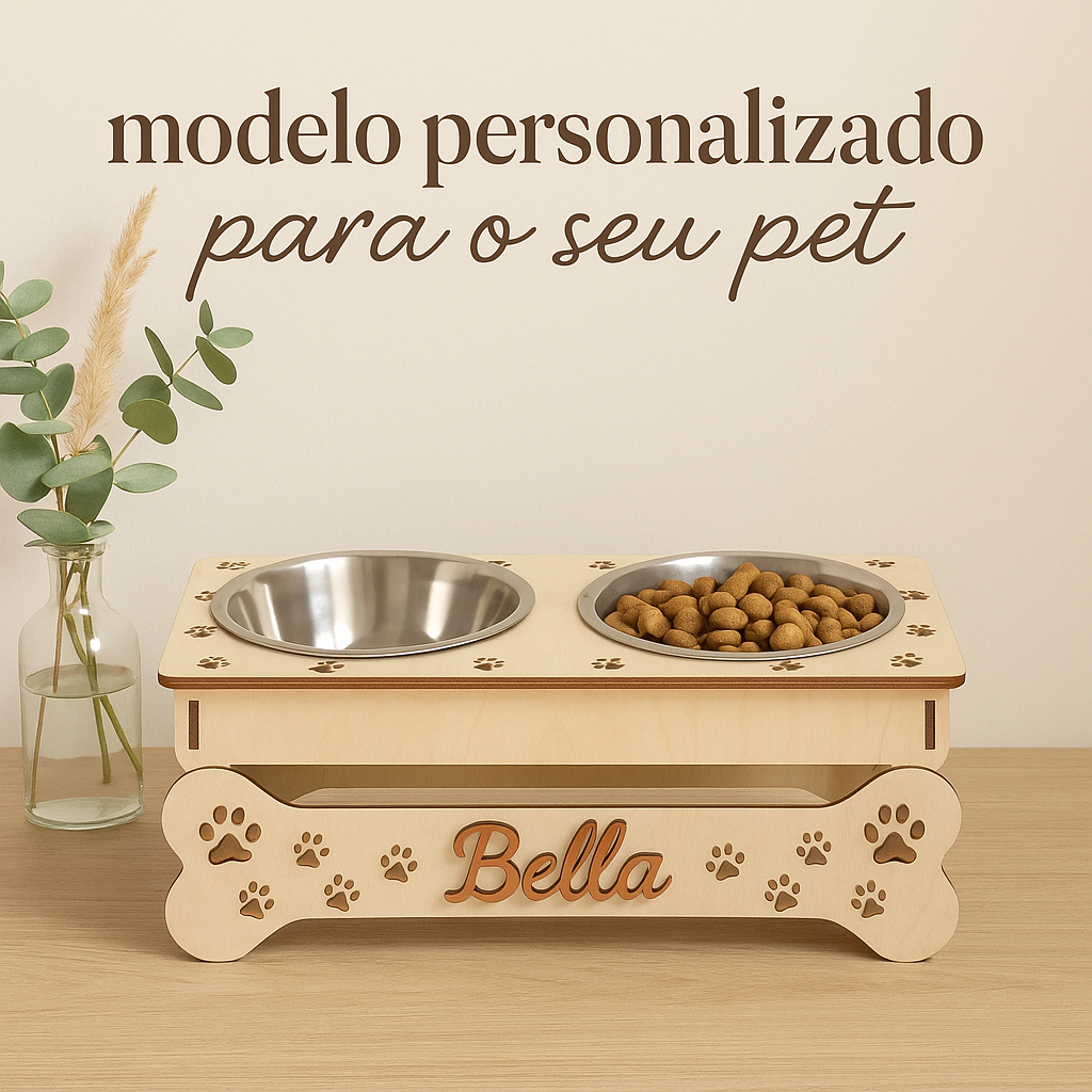 Comedouro Duplo Personalizado em MDF com Tigelas de Inox para Gatos - Estilo Pet Moderno
