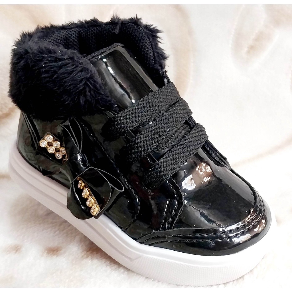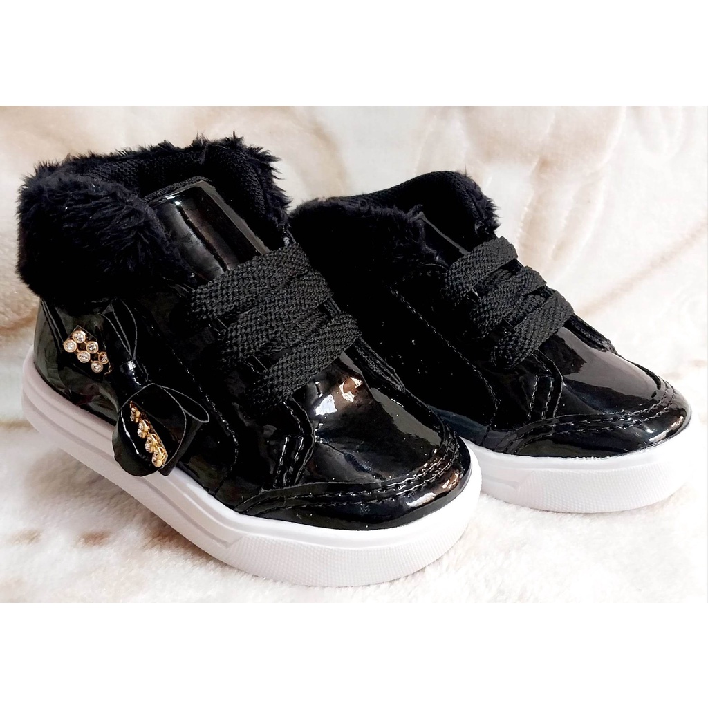 tênis estilo botinha preta verniz com laço menina infantil bebê promoção