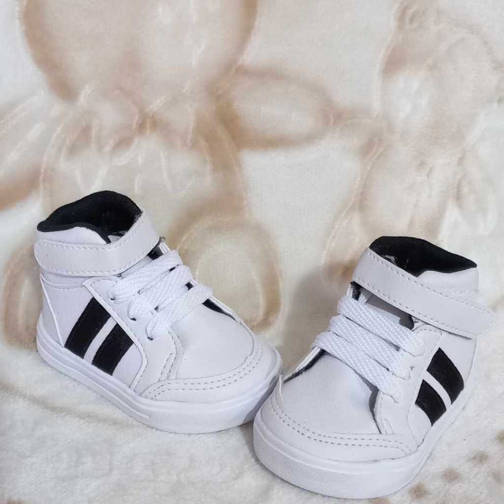 Tênis cano alto estilo botinha de bebê branco com faixa preta unissex infantil