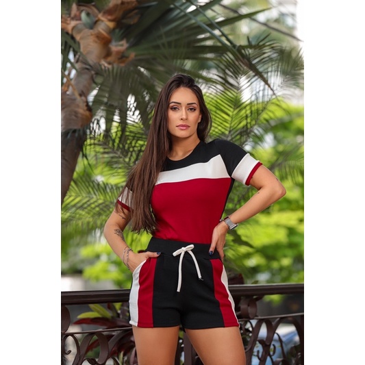Conjunto Feminino Baby Look Blusa Short Malha Crepe verão