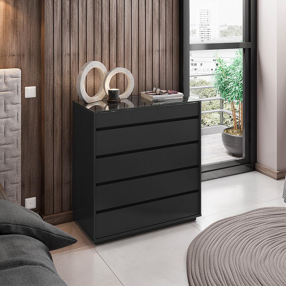 Cômoda Quarto Belize 5 Gavetas e Tampo de Vidro