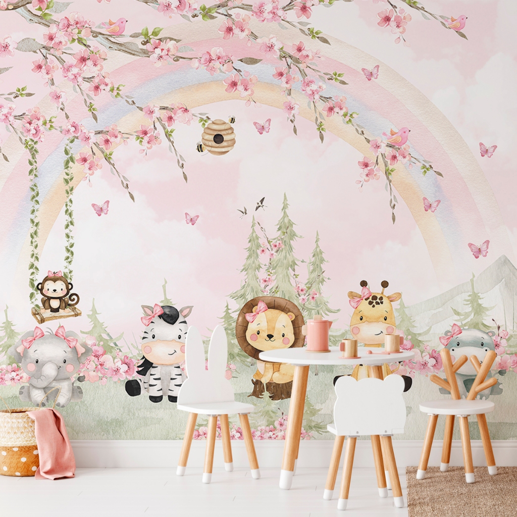 Papel De Parede Adesivo Infantil Safári Floral Aquarela Rosa