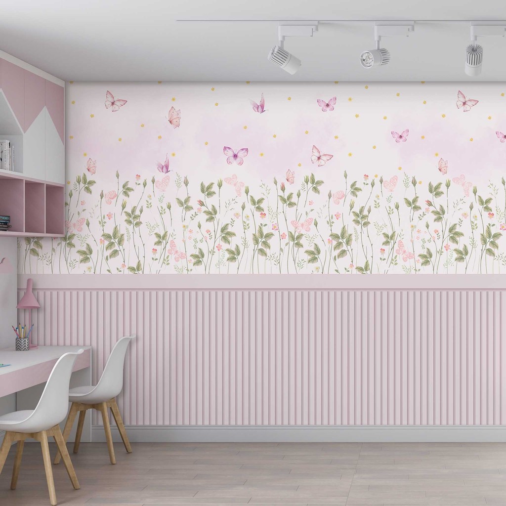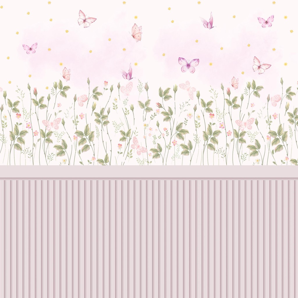 Papel De Parede Adesivo Ripado Floral Rosa Claro Queimado Com Borboletas