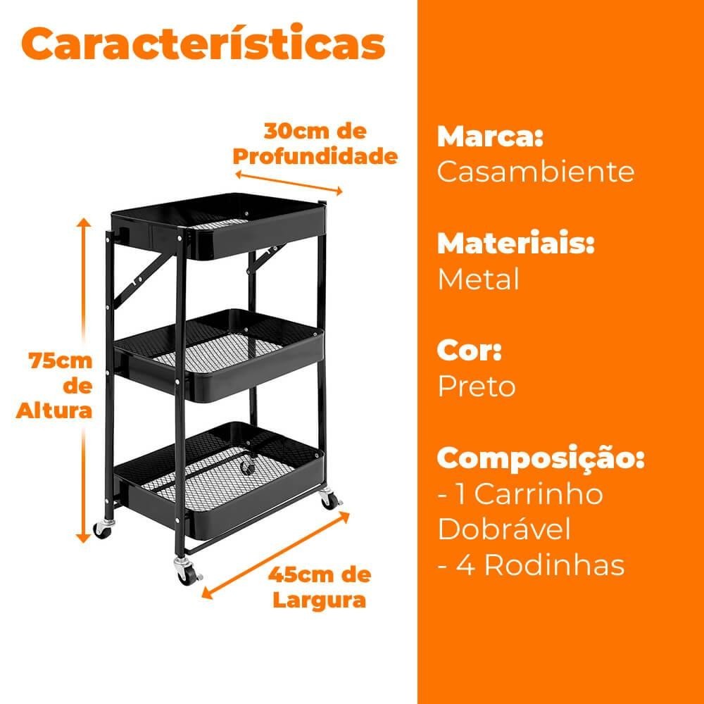 Carrinho Organizador Multiuso Dobrável Com Rodinhas 3 Prateleiras Fruteira Estante - Casambiente