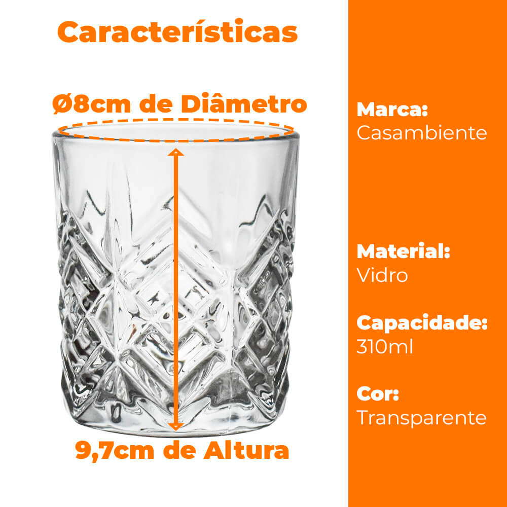 Jogo de Copos de Vidro De Whisky Transparente 310ml 6 peças - Casambiente