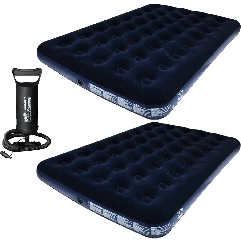 2 Colchões Infláveis De Casal Modelo Queen Azul Marinho Resistente Mais Bomba De Ar E Kit de Reparo