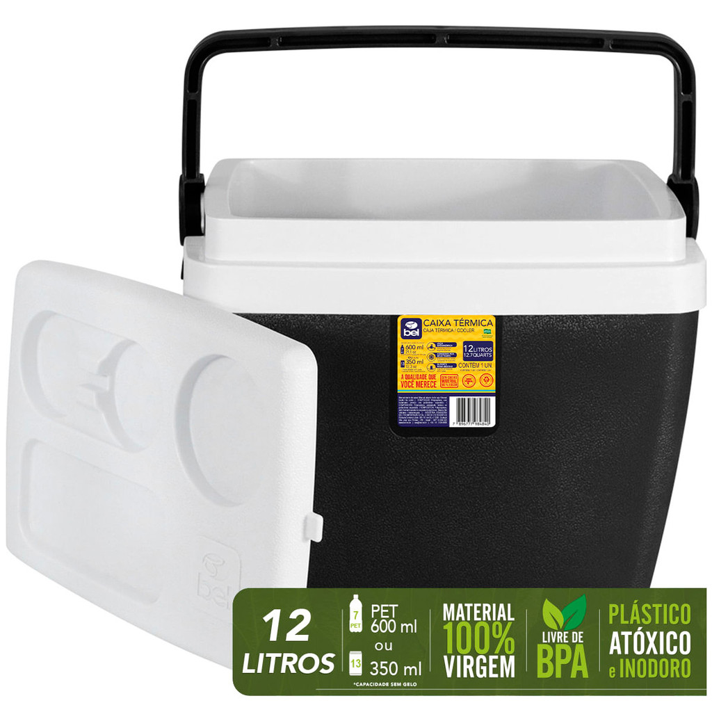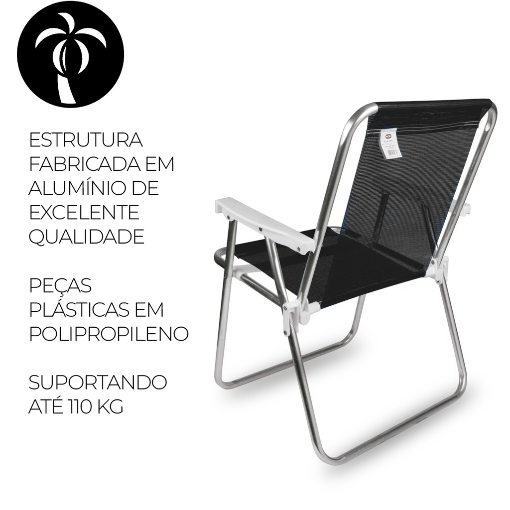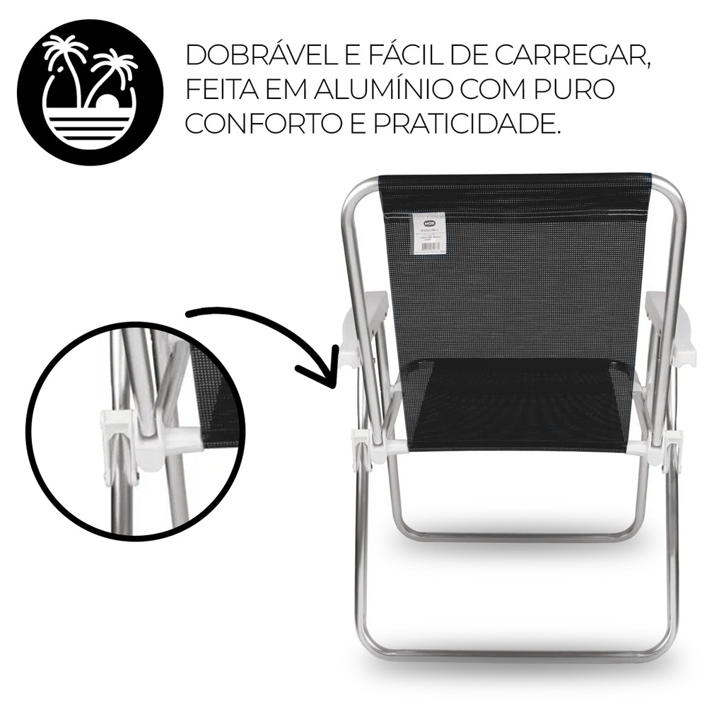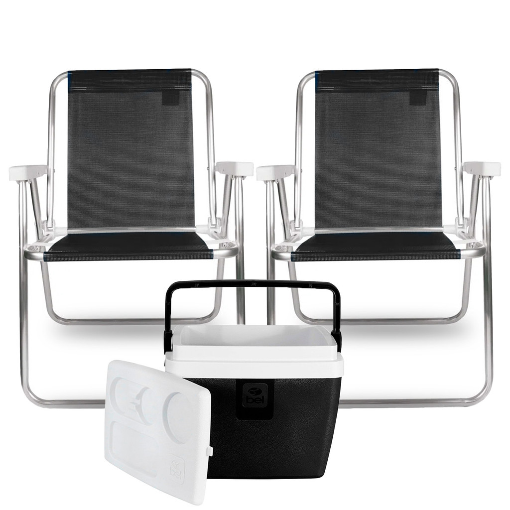 2x Cadeiras de Praia Alta Lazy Alumínio Suporta 110kg Preta + Caixa Térmica 12L Preta/Branca