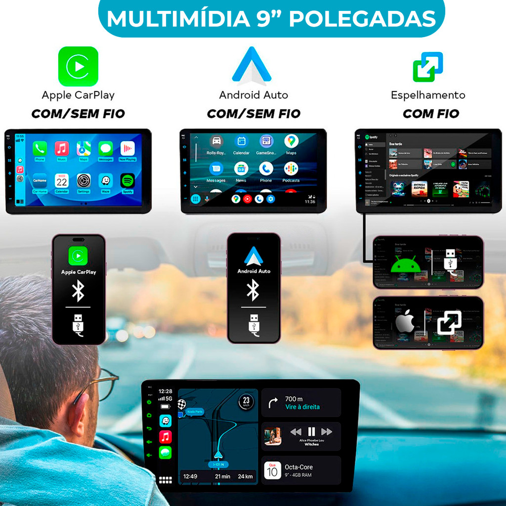 Multimídia 7" 9" Polegadas Com Carplay Android Auto Espelhamento de Celular Bluetooth Tela Sensitiva Mp5 + Câmera de Ré