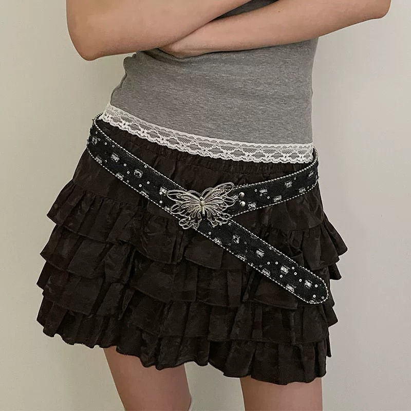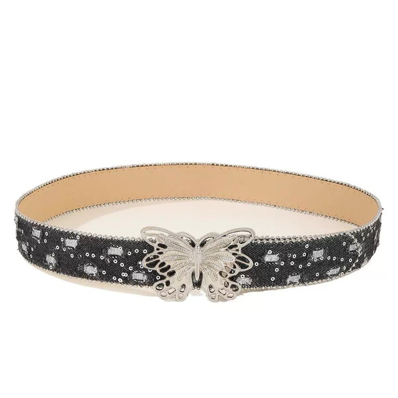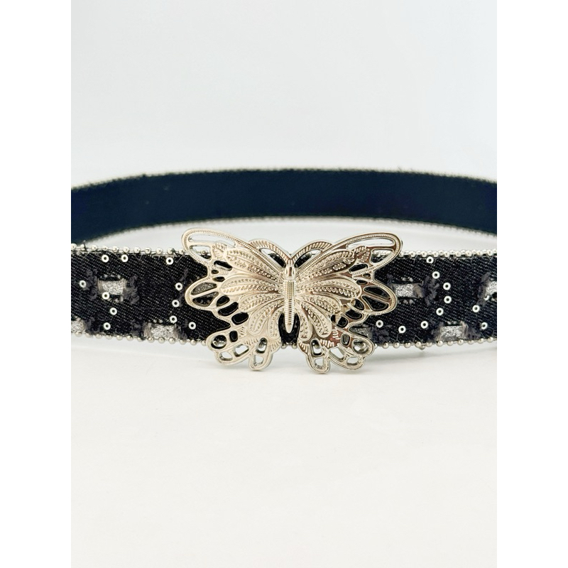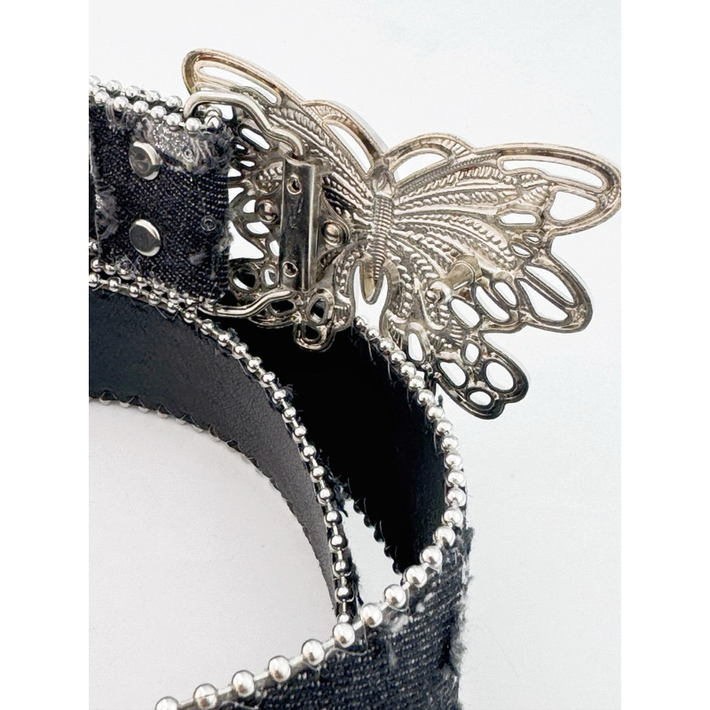 Cinto de Denim Preto de Feminino com Fivela Borboleta Grande e Contas, punk, y2k, Halloween