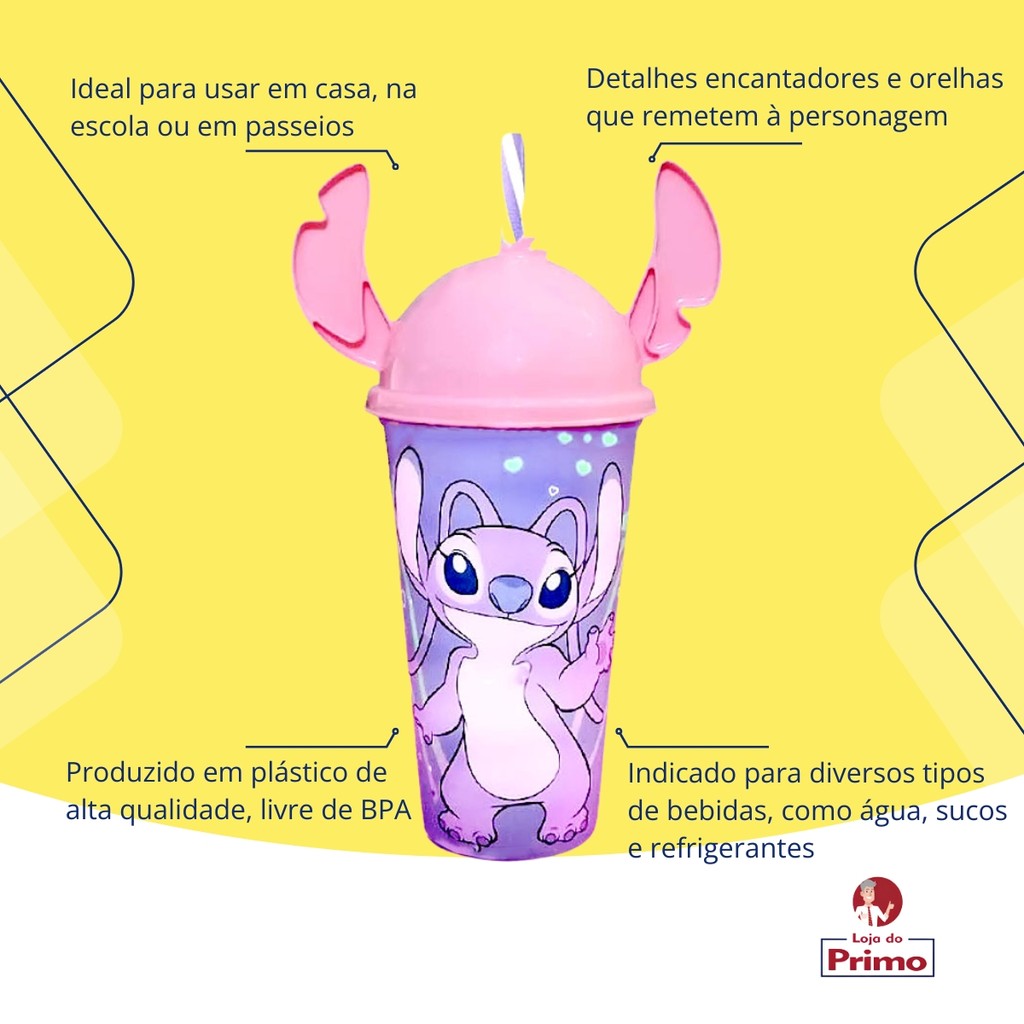 Copo Angel Stitch Com Orelhas 500ml Infantil Rosa Para Água Suco E Refrigerante Plasutil
