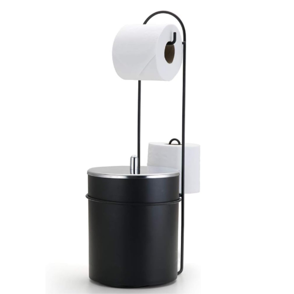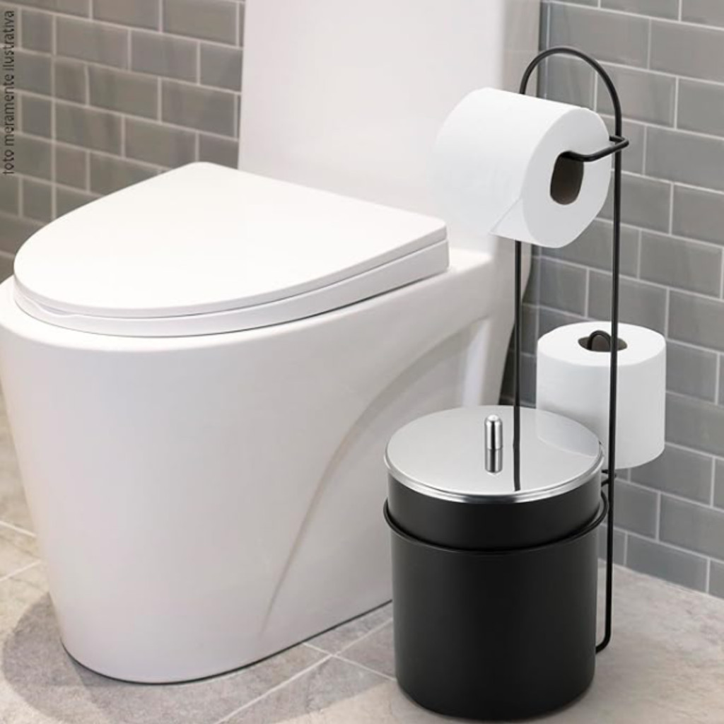 Suporte Papeleira Porta Papel Higiênico De Chão E Lixeira Preto 5 Litros Arthi