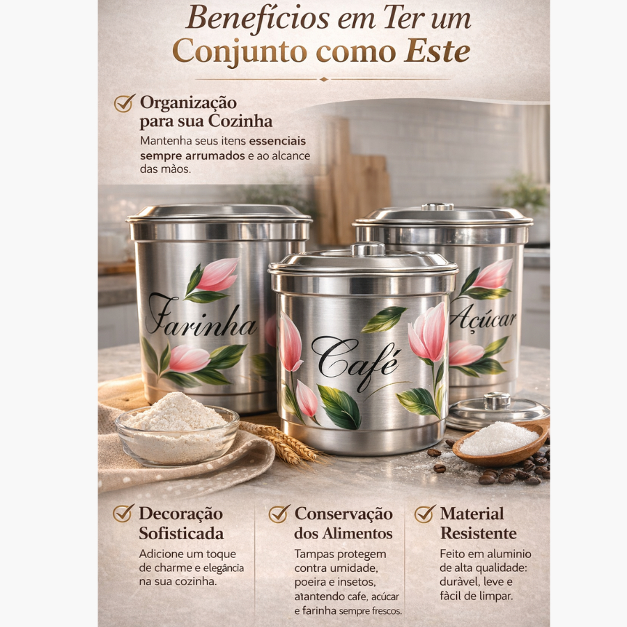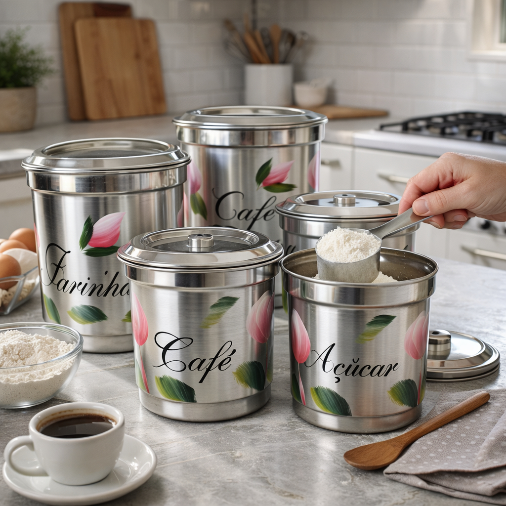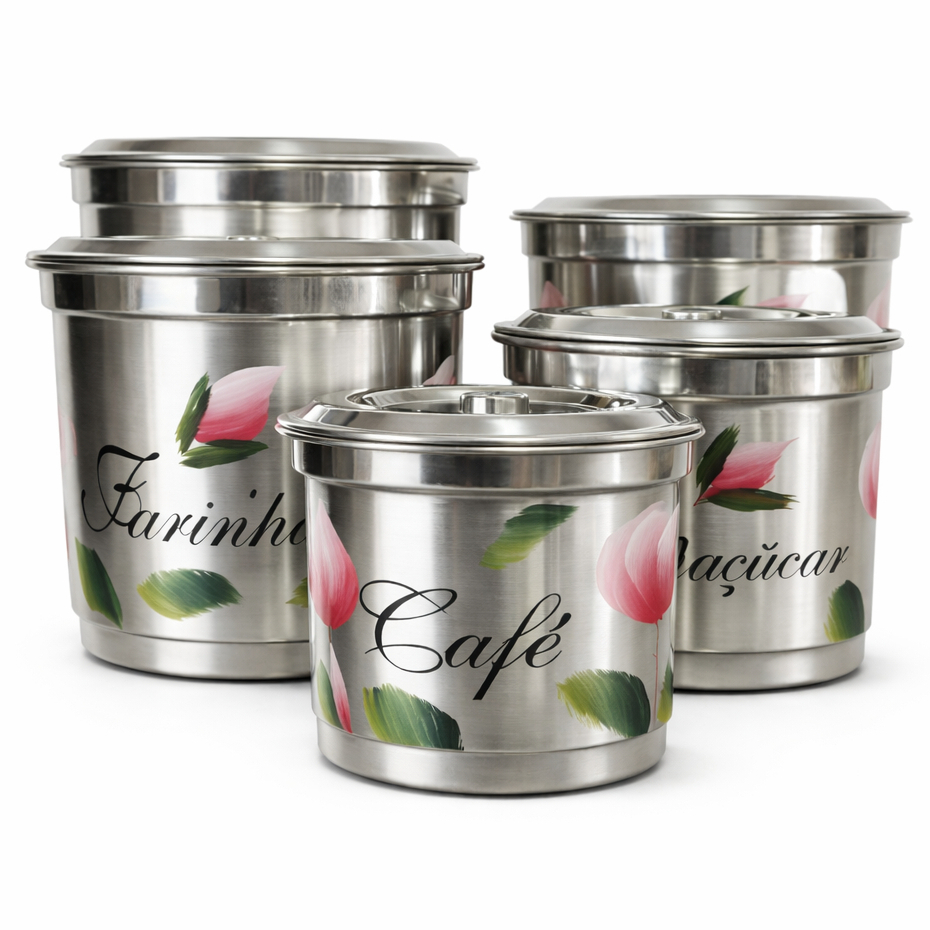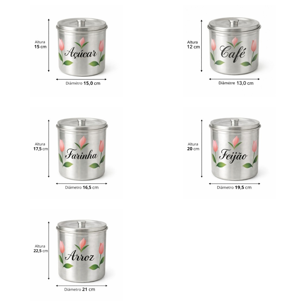 Jogo De Mantimentos 5 Peças Pote Alumínio Kit Lata Decorado Porta Alimentos Para Cozinha