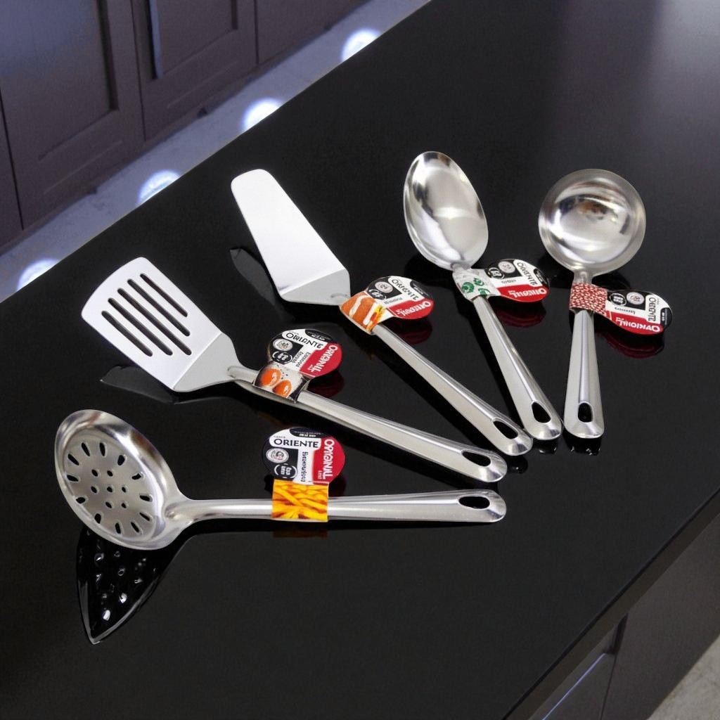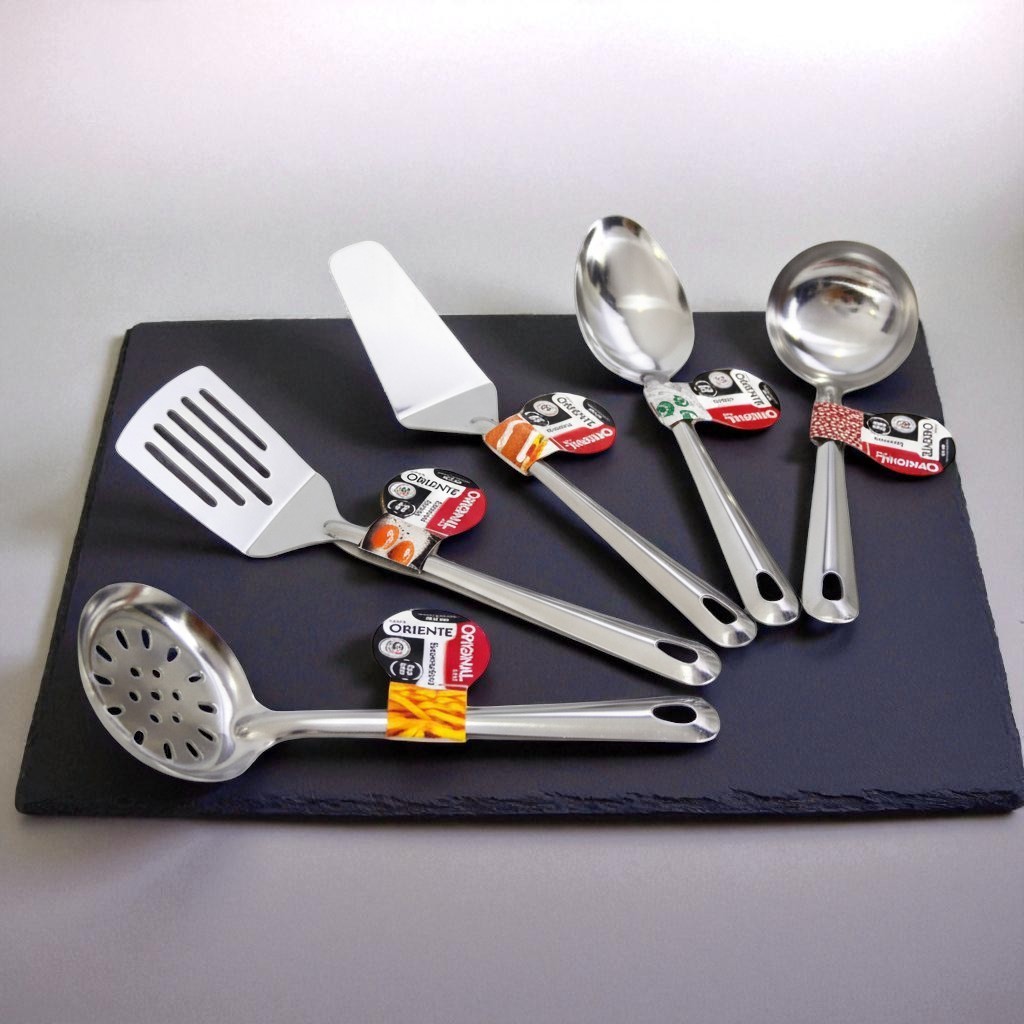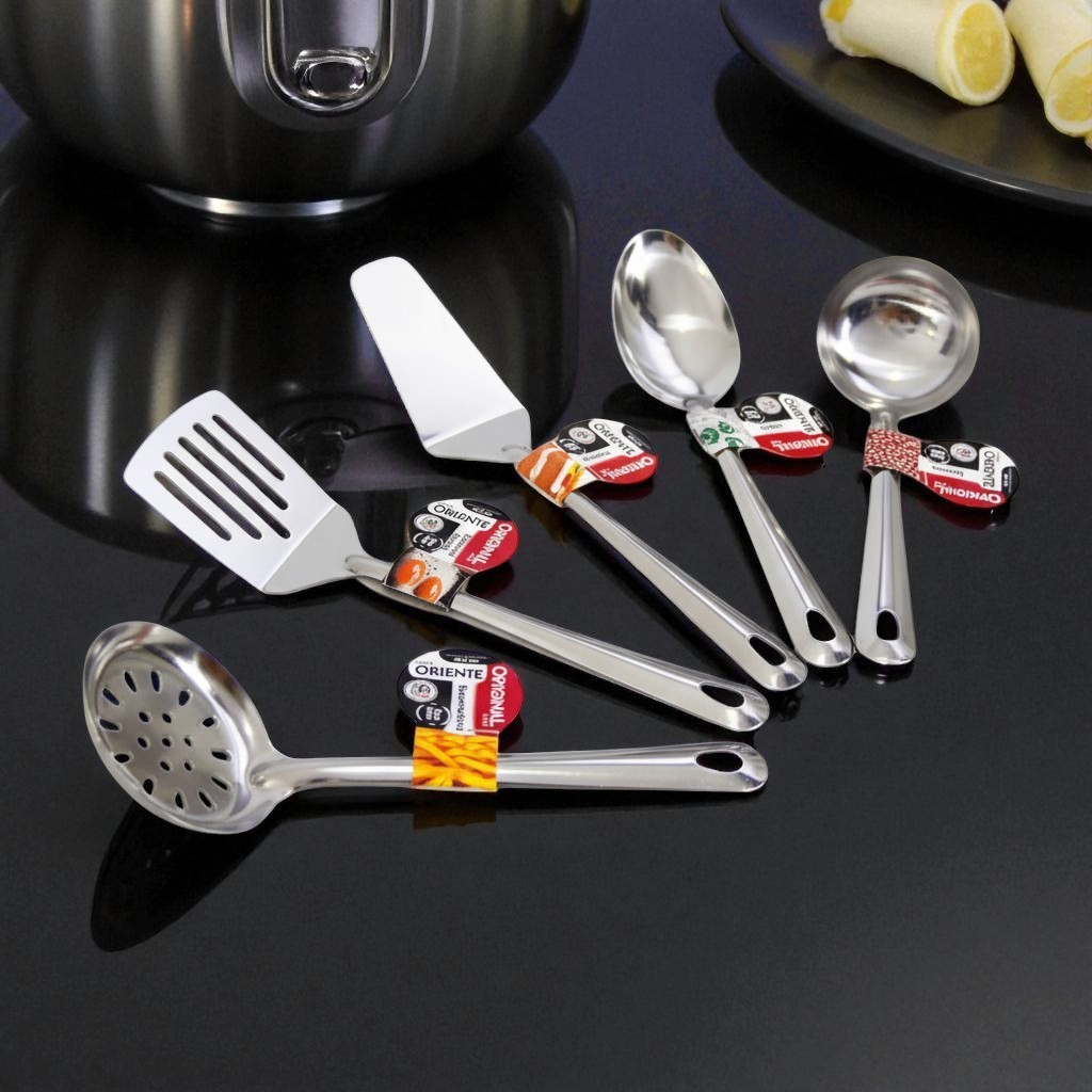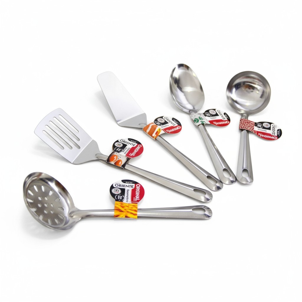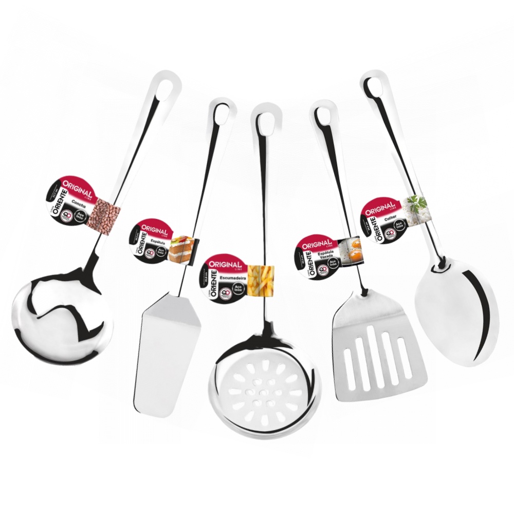 Jogo Kit Utensílios Inox 5 peças - Escumadeira - Concha - Colher - Espátula bolo - Espatula fritura