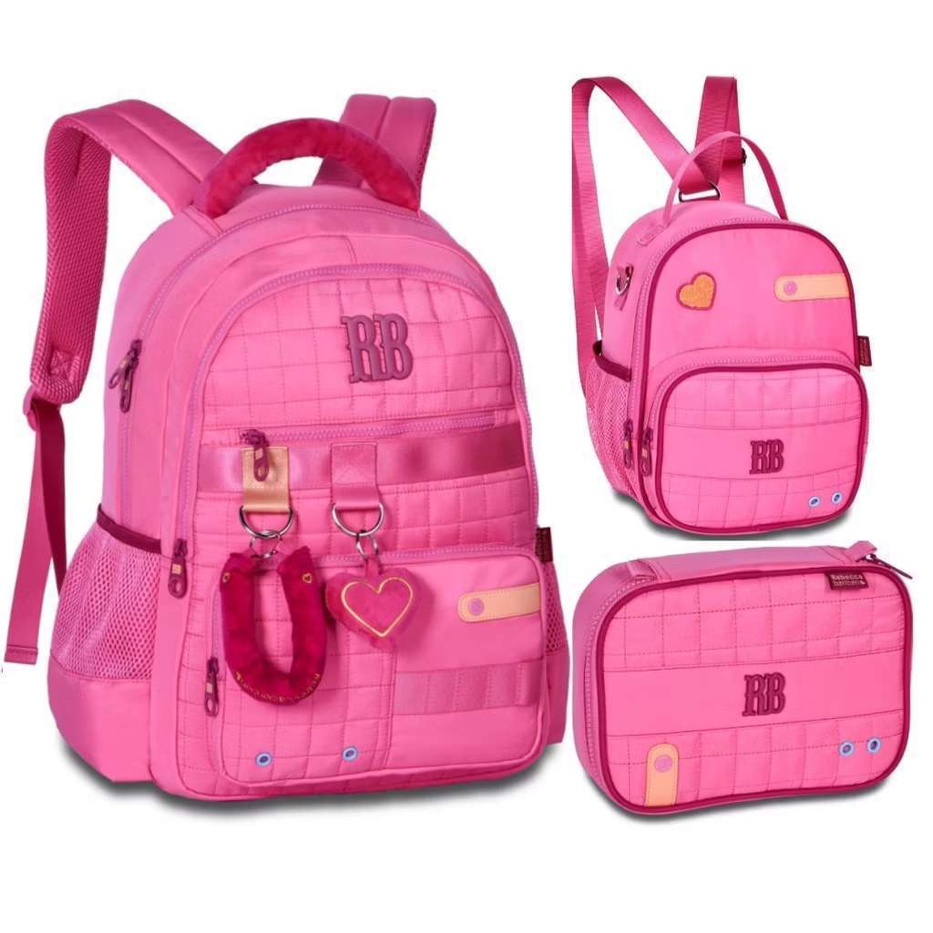 Kit Rebecca Bonbon Costas Rosa Roxa ou Azul Com Chaveiro De Pelinho -Mochila+estojo+lancheira-